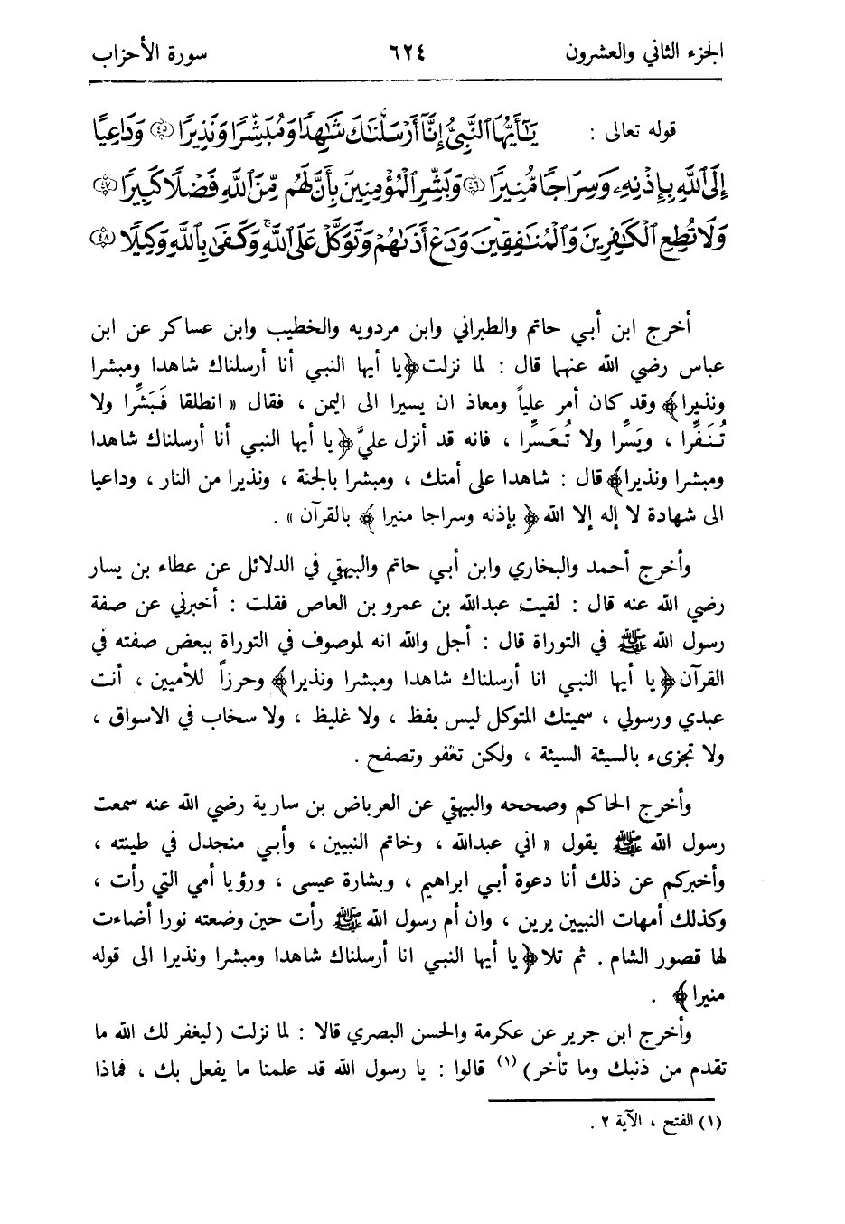 - قَوْله تَعَالَى: يَا أَيهَا النَّبِي إِنَّا أَرْسَلْنَاك شَاهدا وَمُبشرا وَنَذِيرا وداعياً إِلَى الله بِإِذْنِهِ وسراجا منيرا وَبشر الْمُؤمنِينَ بِأَن لَهُم من الله فضلا كَبِيرا وَلَا تُطِع الْكَافرين وَالْمُنَافِقِينَ ودع أذاهم وتوكل على الله وَكفى بِاللَّه وَكيلا