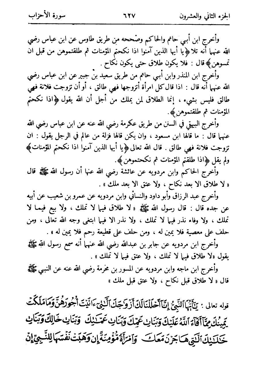 وَأخرج ابْن الْمُنْذر وَابْن أبي حَاتِم من طَرِيق سعيد بن جُبَير عَن ابْن عَبَّاس رَضِي الله عَنْهُمَا أَنه قَالَ: إِذا قَالَ كل امْرَأَة أَتَزَوَّجهَا فَهِيَ طَالِق أَو ان تزوجت فُلَانَة فَهِيَ طَالِق فَلَيْسَ لشَيْء إِنَّمَا الطَّلَاق لمن يملك من أجل أَن الله يَقُول {إِذا نكحتم الْمُؤْمِنَات ثمَّ طلقتموهن}