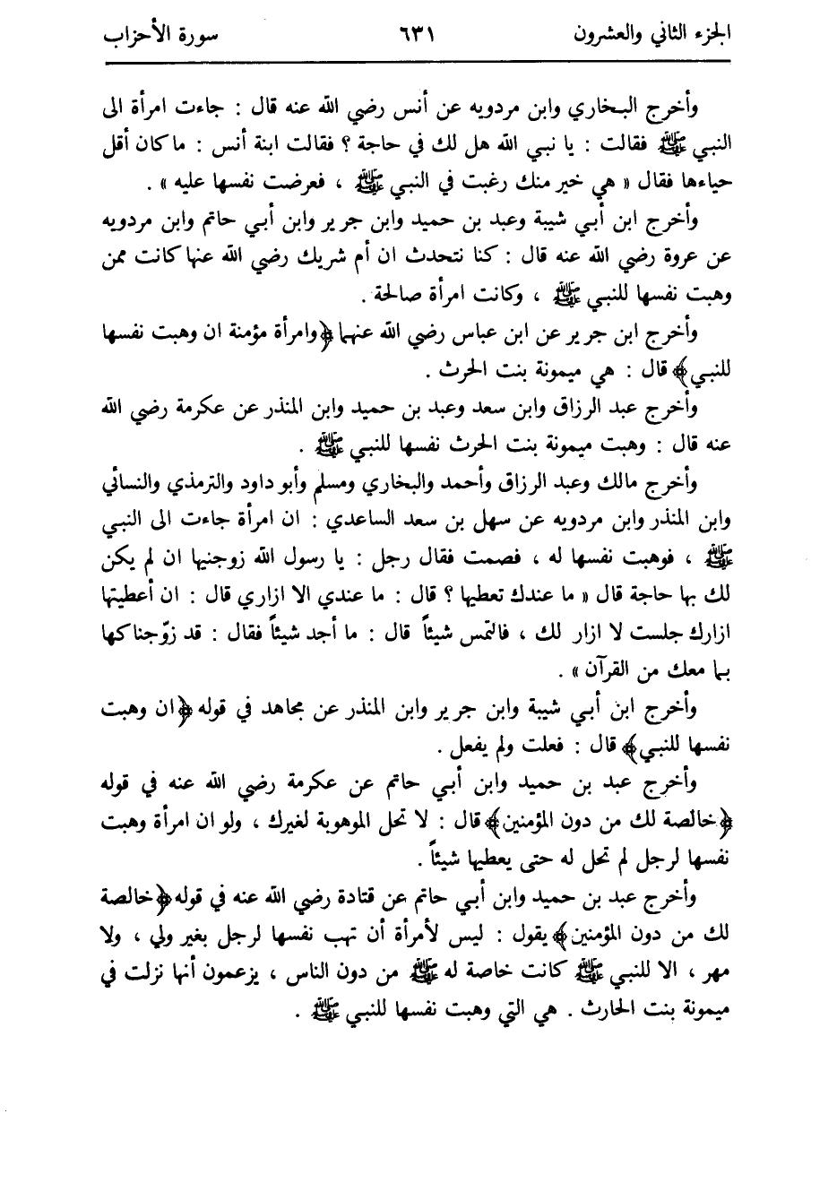 وَأخرج ابْن جرير عَن ابْن عَبَّاس رَضِي الله عَنْهُمَا {وَامْرَأَة مُؤمنَة إِن وهبت نَفسهَا للنَّبِي} قَالَ: هِيَ مَيْمُونَة بنت الْحَرْث