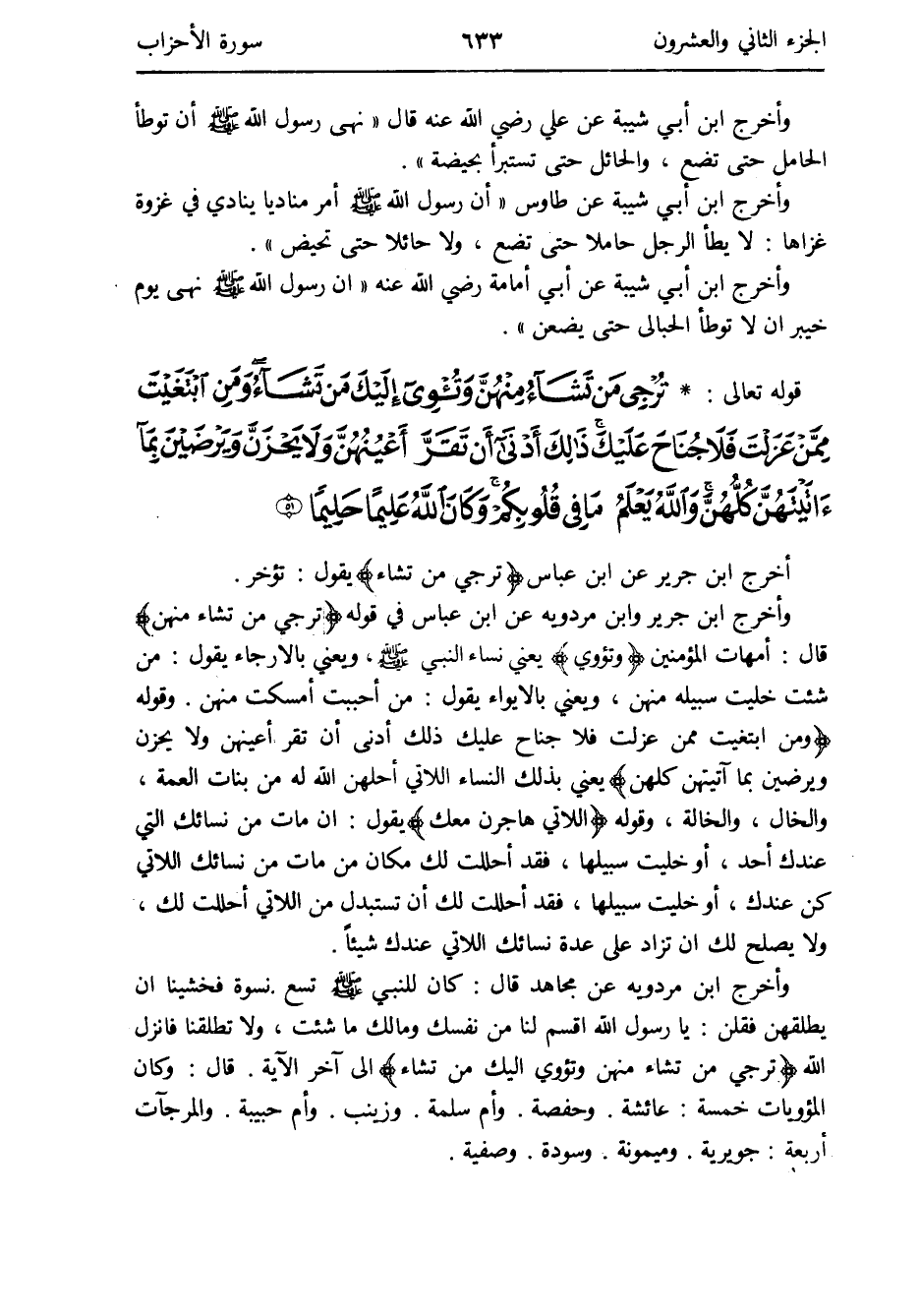 - قَوْله تَعَالَى: ترجي من تشَاء مِنْهُنَّ وَتُؤْوِي إِلَيْك من تشَاء وَمن ابْتَغَيْت مِمَّن عزلت فَلَا جنَاح عَلَيْك ذَلِك أدنى أَن تقر أعينهن وَلَا يحزن ويرضين بِمَا آتيناهن كُلهنَّ وَالله يعلم مَا فِي قُلُوبكُمْ وَكَانَ الله عليما حكيما