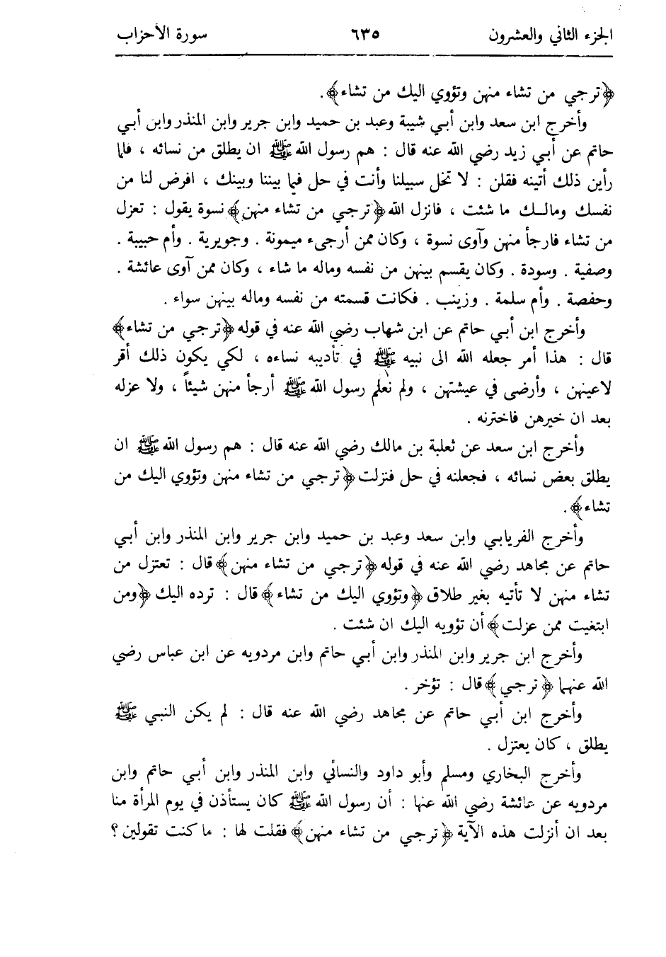 وَأخرج البُخَارِيّ وَمُسلم وَأَبُو دَاوُد وَالنَّسَائِيّ وَابْن الْمُنْذر وَابْن أبي حَاتِم وَابْن مرْدَوَيْه عَن عَائِشَة رَضِي الله عَنْهَا: أَن رَسُول الله صلى الله عَلَيْهِ وَسلم كَانَ يسْتَأْذن فِي يَوْم الْمَرْأَة منا بعد أَن أنزلت هَذِه الْآيَة {ترجي من تشَاء مِنْهُنَّ} فَقلت لَهَا: مَا كنت تَقُولِينَ