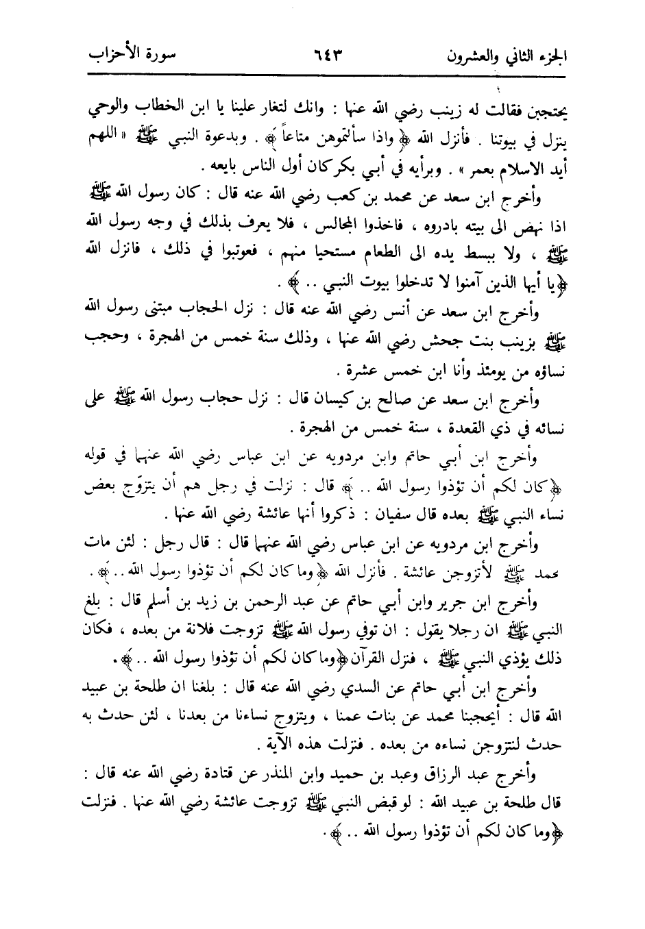 وَأخرج ابْن جرير وَابْن أبي حَاتِم عَن عبد الرَّحْمَن بن زيد بن أسلم قَالَ: بلغ النَّبِي صلى الله عَلَيْهِ وَسلم أَن رجلا يَقُول: إِن توفّي رَسُول الله صلى الله عَلَيْهِ وَسلم تزوجت فُلَانَة من بعده فَكَانَ ذَلِك يُؤْذِي النَّبِي صلى الله عَلَيْهِ وَسلم فَنزل الْقُرْآن {وَمَا كَانَ لكم أَن تُؤْذُوا رَسُول الله}