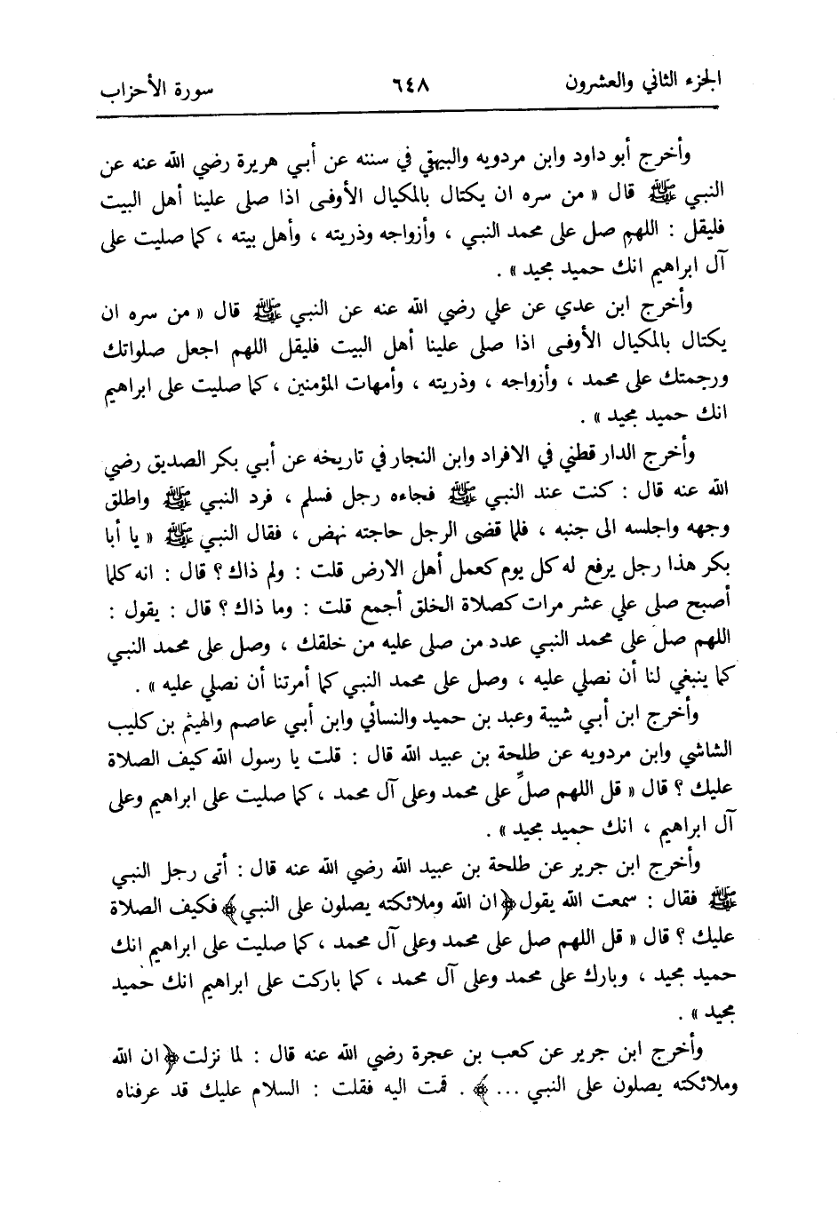 وَأخرج ابْن جرير عَن طَلْحَة بن عبيد الله رَضِي الله عَنهُ قَالَ: أَتَى رجل النَّبِي صلى الله عَلَيْهِ وَسلم فَقَالَ: سَمِعت الله يَقُول {إِن الله وَمَلَائِكَته يصلونَ على النَّبِي} فَكيف الصَّلَاة عَلَيْك قَالَ قل اللَّهُمَّ صل على مُحَمَّد وعَلى آل مُحَمَّد كَمَا صليت على إِبْرَاهِيم انك حميد مجيد وَبَارك على مُحَمَّد وعَلى آل مُحَمَّد كَمَا باركت على إِبْرَاهِيم إِنَّك حميد مجيد
