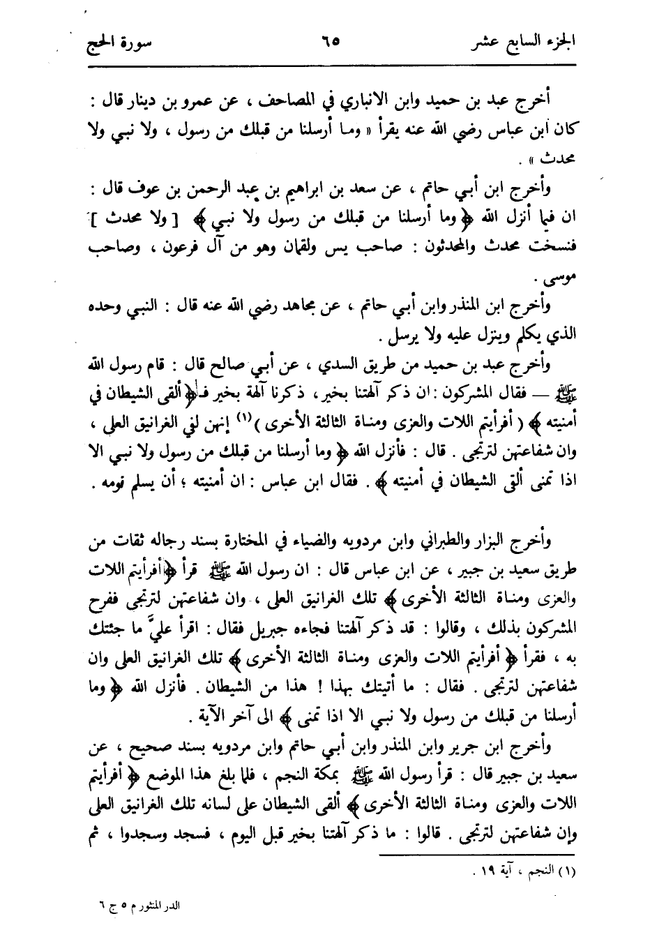 وَأخرج ابْن جرير وَابْن الْمُنْذر وَابْن أبي حَاتِم وَابْن مرْدَوَيْه بِسَنَد صَحِيح عَن سعيد بن جُبَير قَالَ: قَرَأَ رَسُول الله صلى الله عَلَيْهِ وَسلم بِمَكَّة النَّجْم فَلَمَّا بلغ هَذَا الْموضع {أَفَرَأَيْتُم اللات والعزى وَمَنَاة الثَّالِثَة الْأُخْرَى} ألْقى الشَّيْطَان على لِسَانه تِلْكَ الغرانيق العلى وَإِن شفاعتهن لترتجى
