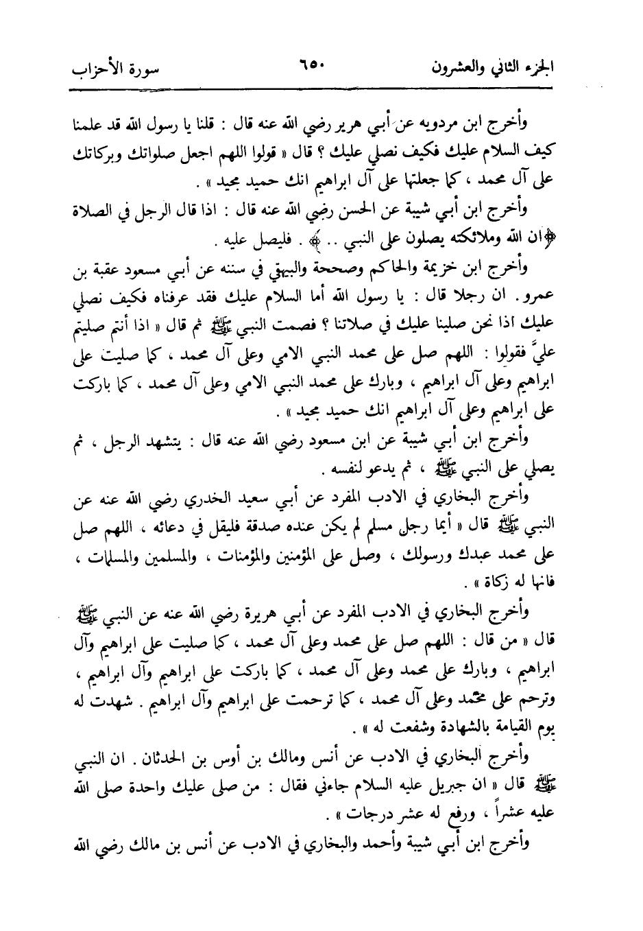 وَأخرج البُخَارِيّ فِي الْأَدَب الْمُفْرد عَن أبي هُرَيْرَة رَضِي الله عَنهُ عَن النَّبِي صلى الله عَلَيْهِ وَسلم قَالَ من قَالَ: اللَّهُمَّ صل على مُحَمَّد وعَلى آل مُحَمَّد كَمَا صليت على إِبْرَاهِيم وَآل إِبْرَاهِيم وَبَارك على مُحَمَّد وعَلى آل مُحَمَّد كَمَا باركت على إِبْرَاهِيم وَآل إِبْرَاهِيم وترحم على مُحَمَّد وعَلى آل مُحَمَّد كَمَا ترحمت على إِبْرَاهِيم وَآل إِبْرَاهِيم