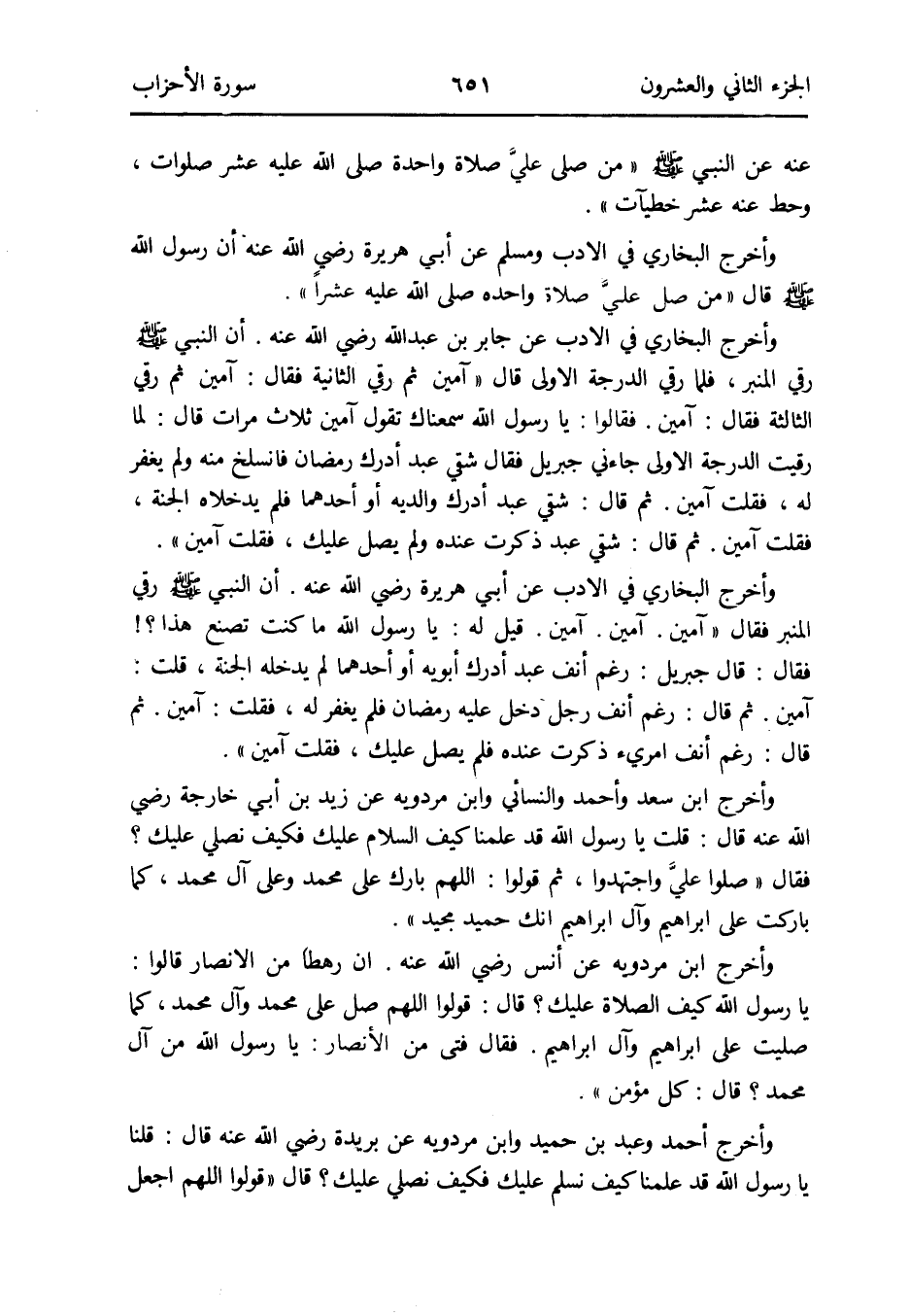وَأخرج البُخَارِيّ فِي الْأَدَب وَمُسلم عَن أبي هُرَيْرَة رَضِي الله عَنهُ أَن رَسُول الله صلى الله عَلَيْهِ وَسلم قَالَ من صل عليَّ صَلَاة وَاحِدَة صلى الله عَلَيْهِ عشرا