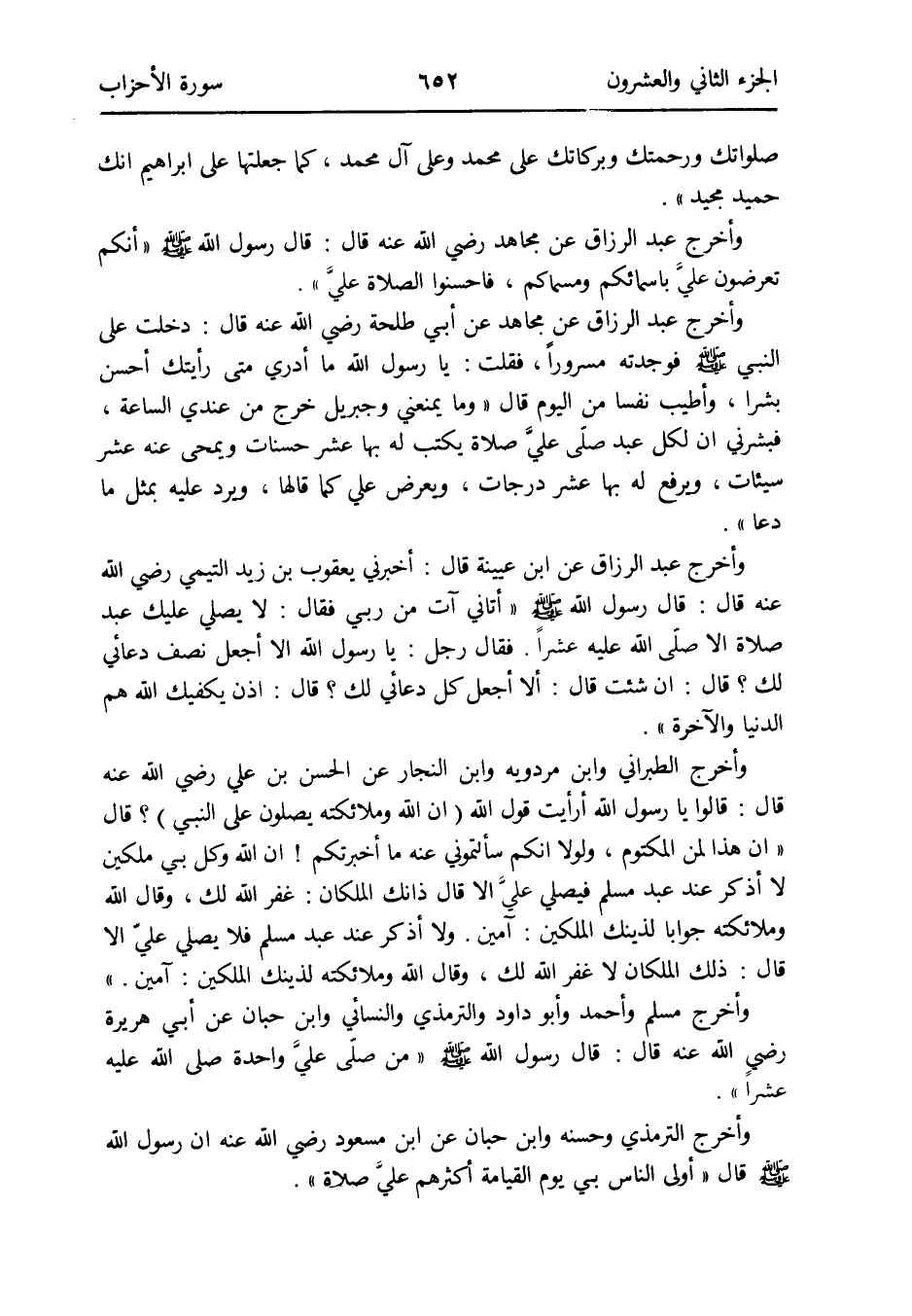 وَأخرج عبد الرَّزَّاق عَن مُجَاهِد عَن أبي طَلْحَة رَضِي الله عَنهُ قَالَ: دخلت على النَّبِي صلى الله عَلَيْهِ وَسلم فَوَجَدته مَسْرُورا فَقلت: يَا رَسُول الله مَا أَدْرِي مَتى رَأَيْتُك أحسن بشرا وَأطيب نفسا من الْيَوْم قَالَ وَمَا يَمْنعنِي وَجِبْرِيل خرج من عِنْدِي السَّاعَة فبشرني أَن لكل عبد صلّى عليَّ صَلَاة يكْتب لَهُ بهَا عشر حَسَنَات ويمحى عَنهُ عشر سيئات وَيرْفَع لَهُ بهَا عشر دَرَجَات ويعرض عَليّ كَمَا قَالَهَا وَيرد عَلَيْهِ بِمثل مَا دَعَا