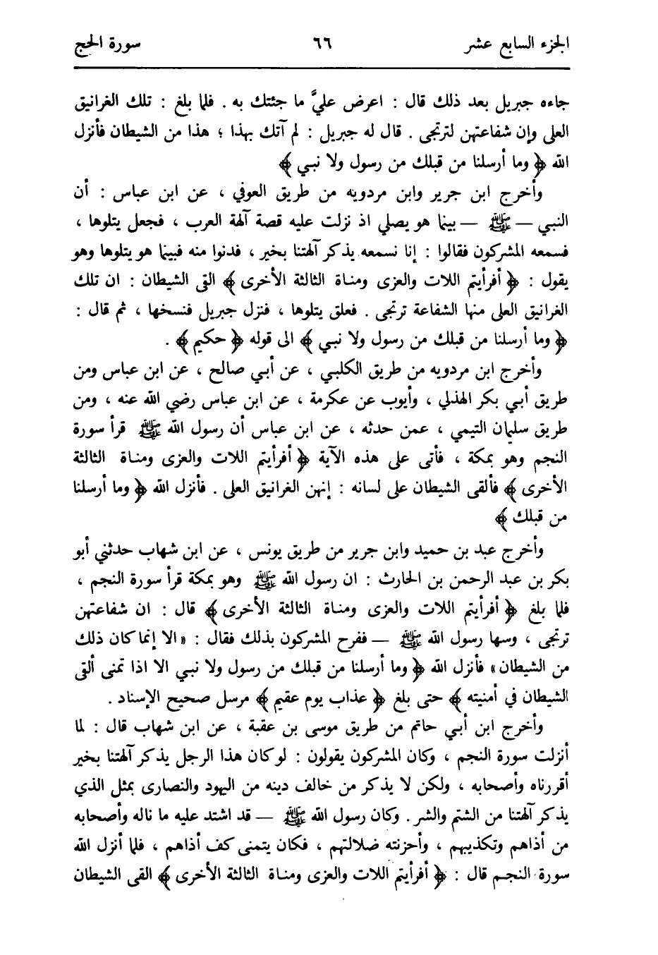 وَأخرج ابْن جرير وَابْن مرْدَوَيْه من طَرِيق الْعَوْفِيّ عَن ابْن عَبَّاس: أَن النَّبِي - صلى الله عَلَيْهِ وَسلم - بَيْنَمَا هُوَ يُصَلِّي إِذْ نزلت عَلَيْهِ قصَّة آلِهَة الْعَرَب فَجعل يتلوها فَسَمعهُ الْمُشْركُونَ فَقَالُوا: إِنَّا نَسْمَعهُ يذكر آلِهَتنَا بِخَير فدنوا مِنْهُ فَبَيْنَمَا هُوَ يتلوها وَهُوَ يَقُول: {أَفَرَأَيْتُم اللات والعزى وَمَنَاة الثَّالِثَة الْأُخْرَى} ألْقى الشَّيْطَان: إِن تِلْكَ الغرانيق العلى مِنْهَا الشَّفَاعَة ترتجى