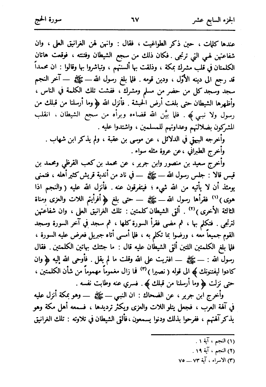 فَلَمَّا بلغ رَسُول الله - صلى الله عَلَيْهِ وَسلم - آخر النَّجْم سجد وَسجد كل من حضر من مُسلم ومشرك ففشت تِلْكَ الْكَلِمَة فِي النَّاس وأظهرها الشَّيْطَان حَتَّى بلغت أَرض الْحَبَشَة