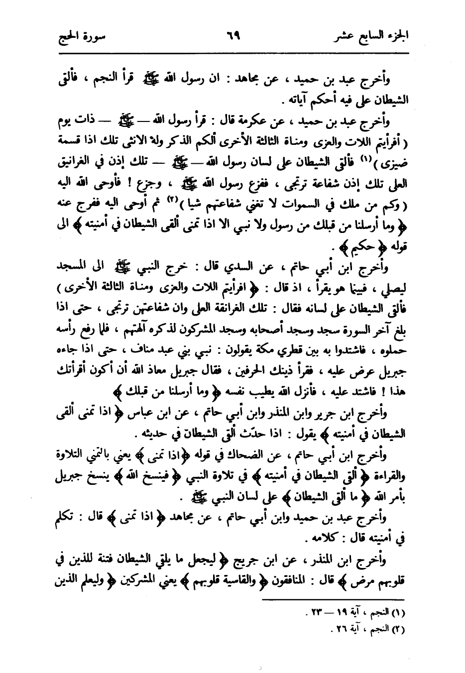 وَأخرج عبد بن حميد عَن عِكْرِمَة قَالَ: قَرَأَ رَسُول الله - صلى الله عَلَيْهِ وَسلم - ذَات يَوْم {أَفَرَأَيْتُم اللات والعزى وَمَنَاة الثَّالِثَة الْأُخْرَى ألكم الذّكر وَله الْأُنْثَى تِلْكَ إِذا قسْمَة ضيزى} النَّجْم آيَة 19 - 23 فَألْقى الشَّيْطَان على لِسَان رَسُول الله - صلى الله عَلَيْهِ وَسلم - تِلْكَ إِذن فِي الغرانيق العلى تِلْكَ إِذن شَفَاعَة ترتجى فَفَزعَ رَسُول الله - صلى الله عَلَيْهِ وَسلم - وجزع فَأوحى الله إِلَيْهِ {وَكم من ملك فِي السَّمَاوَات لَا تغني شفاعتهم شَيْئا} النَّجْم آيَة 26 ثمَّ أوحى إِلَيْهِ فَفرج عَنهُ {وَمَا أرسلنَا من قبلك من رَسُول وَلَا نَبِي إِلَّا إِذا تمنى ألْقى الشَّيْطَان فِي أمْنِيته} إِلَى قَوْله {حَكِيم}