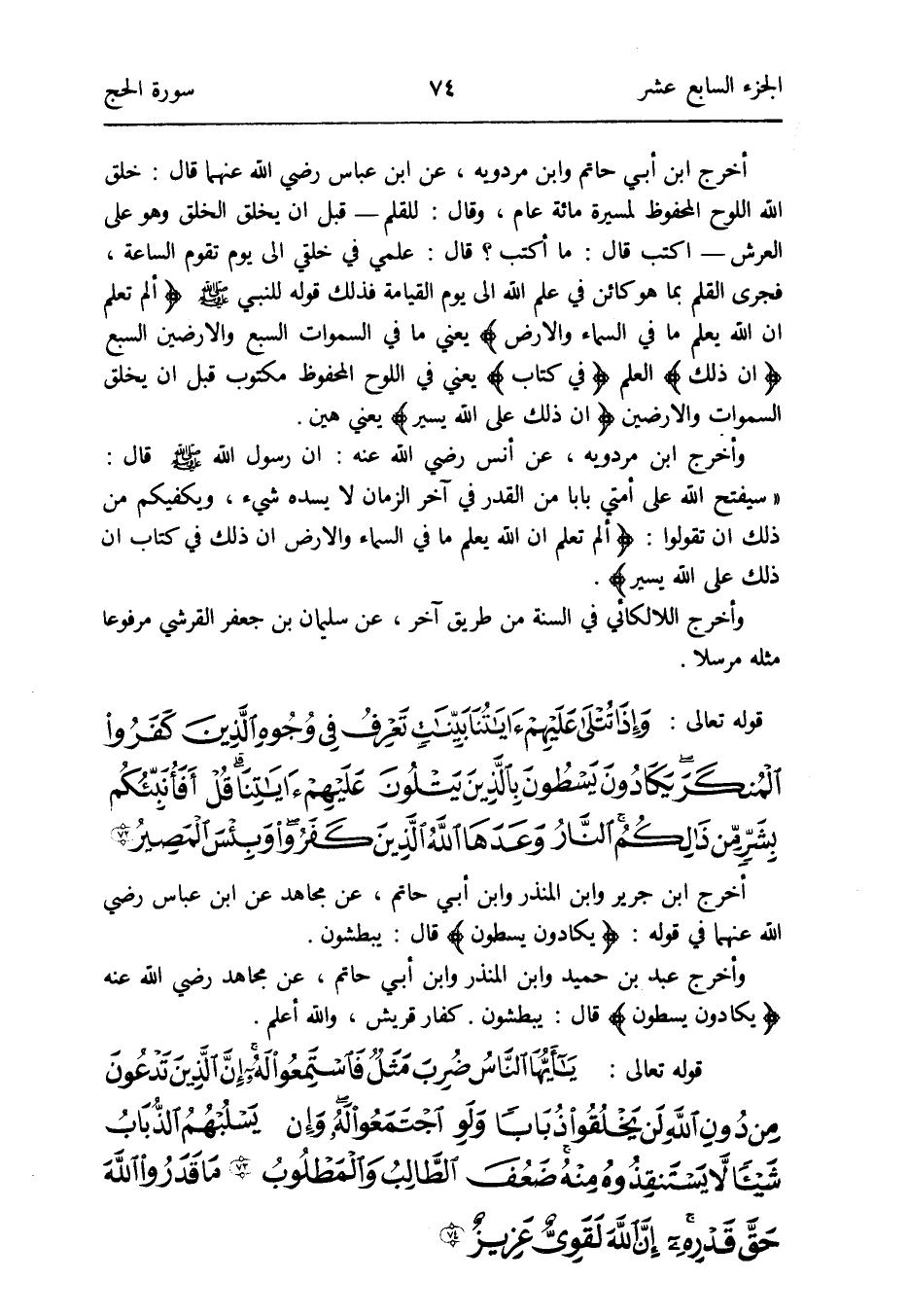 أخرج ابْن أبي حَاتِم وَابْن مرْدَوَيْه عَن ابْن عَبَّاس رَضِي الله عَنْهُمَا قَالَ: خلق الله اللَّوْح الْمَحْفُوظ لمسيرة مائَة عَام وَقَالَ: للقلم - قبل أَن يخلق الْخلق وَهُوَ على الْعَرْش - اكْتُبْ قَالَ: مَا أكتب قَالَ: علمي فِي خلقي إِلَى يَوْم تقوم السَّاعَة فَجرى الْقَلَم بِمَا هُوَ كَائِن فِي علم الله إِلَى يَوْم الْقِيَامَة فَذَلِك قَوْله للنَّبِي - صلى الله عَلَيْهِ وَسلم - {ألم تعلم أَن الله يعلم مَا فِي السَّمَاء وَالْأَرْض} يَعْنِي مَا فِي السَّمَوَات السَّبع وَالْأَرضين السَّبع {إِن ذَلِك} الْعلم {فِي كتاب} يَعْنِي فِي اللَّوْح الْمَحْفُوظ مَكْتُوب قبل أَن يخلق السَّمَوَات وَالْأَرضين {إِن ذَلِك على الله يسير} يَعْنِي هَين