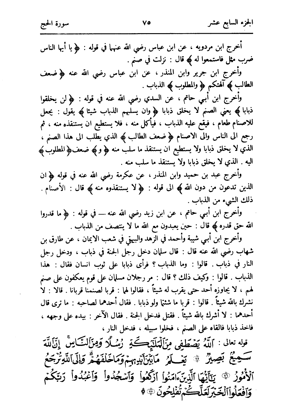 - قَوْله تَعَالَى: الله يصطفي من الْمَلَائِكَة رسلًا وَمن النَّاس إِن الله سميع بَصِير يعلم مَا بَين أَيْديهم وَمَا خَلفهم وَإِلَى الله ترجع الْأُمُور ياأيها الَّذين آمنُوا ارْكَعُوا واسجدوا واعبدوا ربكُم وافعلوا الْخَيْر لَعَلَّكُمْ تفلحون