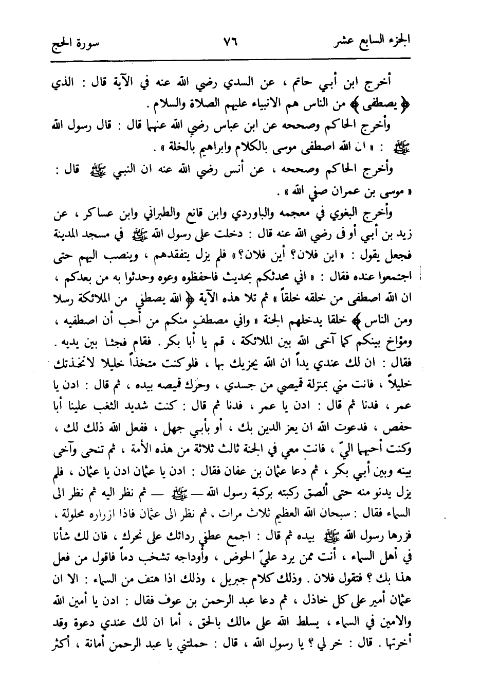 وَأخرج الْبَغَوِيّ فِي مُعْجَمه والباوردي وَابْن قَانِع وَالطَّبَرَانِيّ وَابْن عَسَاكِر عَن زيد بن أبي أوفى رَضِي الله عَنهُ قَالَ: دخلت على رَسُول الله - صلى الله عَلَيْهِ وَسلم - فِي مَسْجِد الْمَدِينَة فَجعل يَقُول: أَيْن فلَان أَيْن فلَان فَلم يزل يتفقدهم وَينصب إِلَيْهِم حَتَّى اجْتَمعُوا عِنْده فَقَالَ: إِنِّي محدثكم بِحَدِيث فاحفظوه وعوه وَحَدثُوا بِهِ من بعدكم إِن الله اصْطفى من خلقه خلقا ثمَّ تَلا هَذِه الْآيَة {الله يصطفي من الْمَلَائِكَة رسلًا وَمن النَّاس} خلقا يدخلهم الْجنَّة وَإِنِّي مصطفٍ مِنْكُم من أحب أَن اصطفيه ومؤاخ بَيْنكُم كَمَا آخى الله بَين الْمَلَائِكَة قُم يَا أَبَا بكر