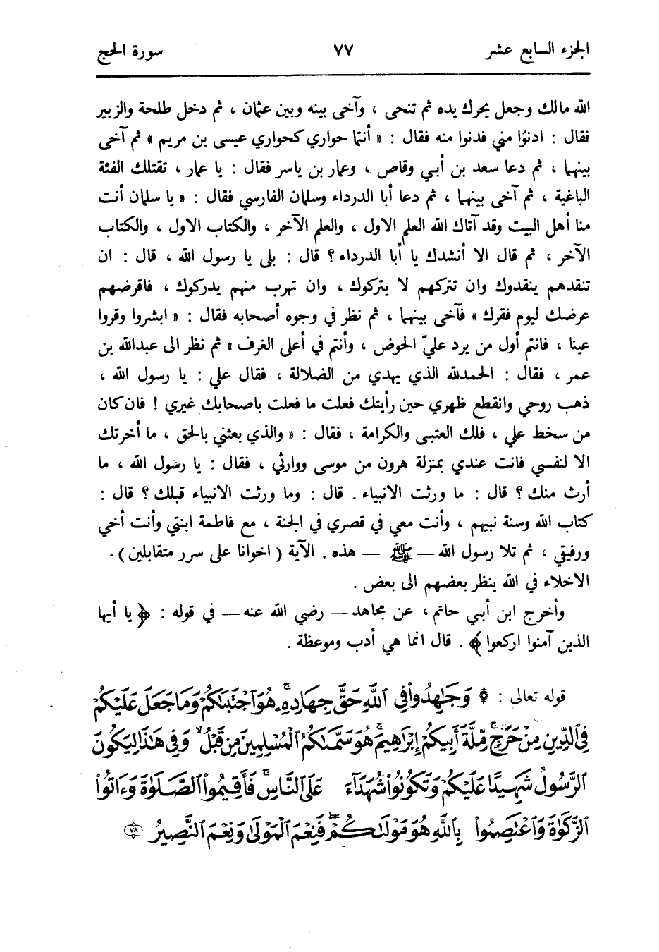 - قَوْله تَعَالَى: وَجَاهدُوا فِي الله حق جهاده هُوَ اجتباكم وَمَا جعل عَلَيْكُم فِي الدّين من حرج مِلَّة أبيكم إِبْرَاهِيم هُوَ سَمَّاكُم الْمُسلمين من قبل وَفِي هَذَا ليَكُون الرَّسُول شَهِيدا عَلَيْكُم وتكونوا شُهَدَاء على النَّاس فأقيموا الصَّلَاة وَآتوا الزَّكَاة واعتصموا بِاللَّه هُوَ مولاكم فَنعم الْمولى وَنعم النصير