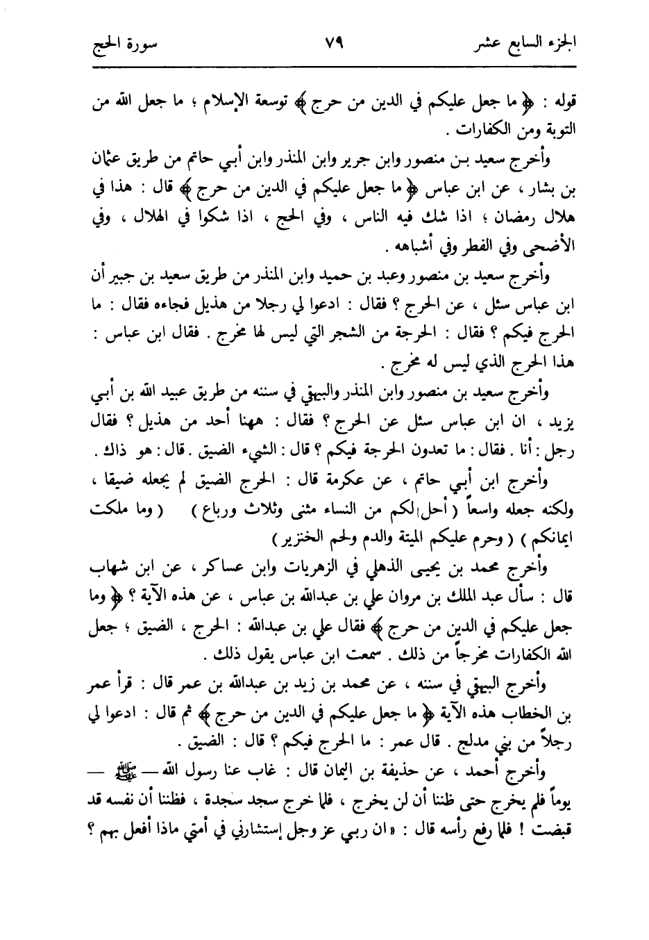 وَأخرج سعيد بن مَنْصُور وَابْن جرير وَابْن الْمُنْذر وَابْن أبي حَاتِم من طَرِيق عُثْمَان بن بشار عَن ابْن عَبَّاس {وَمَا جعل عَلَيْكُم فِي الدّين من حرج} قَالَ: هَذَا فِي هِلَال رَمَضَان إِذا شكّ فِيهِ النَّاس وَفِي الْحَج إِذا شكوا فِي الْهلَال وَفِي الْأَضْحَى وَفِي الْفطر وَفِي أشباهه