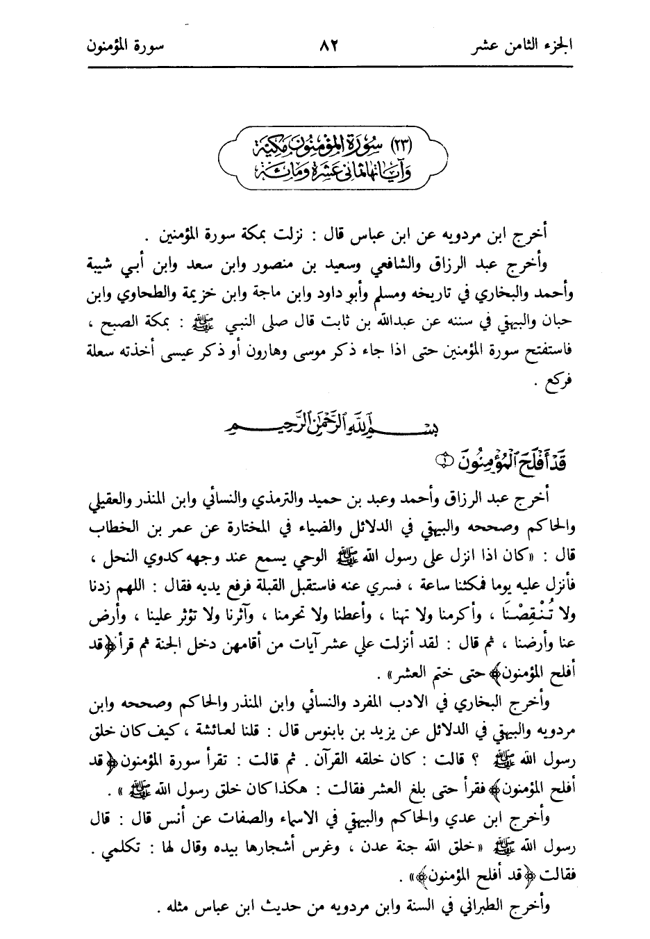 مُقَدّمَة سُورَة الْمُؤْمِنُونَ أخرج ابْن مرْدَوَيْه عَن ابْن عَبَّاس قَالَ: نزلت بِمَكَّة سُورَة الْمُؤمنِينَ