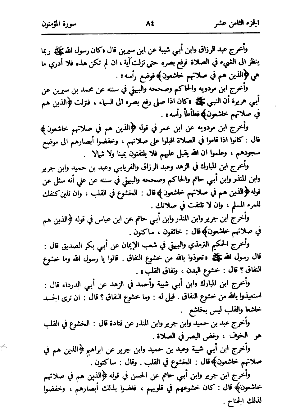 وَأخرج ابْن مرْدَوَيْه عَن ابْن عمر فِي قَوْله {الَّذين هم فِي صلَاتهم خاشعون} قَالَ: كَانُوا إِذا قَامُوا فِي الصَّلَاة اقْبَلُوا على صلَاتهم وخفضوا أَبْصَارهم إِلَى مَوضِع سجودهم وَعَلمُوا أَن الله يقبل عَلَيْهِم فَلَا يلتفتون يَمِينا لَوْلَا شمالاً