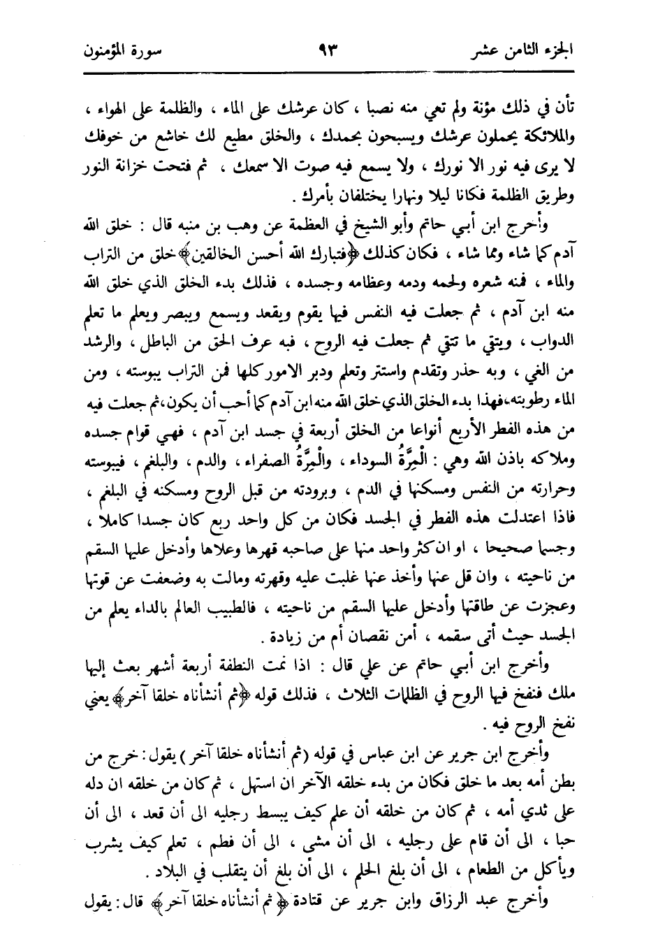 وَأخرج ابْن أبي حَاتِم وَأَبُو الشَّيْخ فِي العظمة عَن وهب بن مُنَبّه قَالَ: خلق الله آدم كَمَا شَاءَ وَمِمَّا شَاءَ فَكَانَ كَذَلِك {فَتَبَارَكَ الله أحسن الْخَالِقِينَ} خلق من التُّرَاب وَالْمَاء فَمِنْهُ شعره ولحمه وَدَمه وعظامه وَجَسَده فَذَلِك بَدْء الْخلق الَّذِي خلق الله مِنْهُ ابْن آدم ثمَّ جعلت فِيهِ النَّفس فِيهَا يقوم وَيقْعد وَيسمع ويبصر وَيعلم مَا تعلم الدَّوَابّ وَيَتَّقِي مَا تتقي ثمَّ جعلت فِيهِ الرّوح فبه عرف الْحق من الْبَاطِل والرشد من الغي وَبِه حذر وَتقدم واستتر وَتعلم ودبر الْأُمُور كلهَا فَمن التُّرَاب يبوسته وَمن المَاء رطوبته فَهَذَا بَدْء الْخلق الَّذِي خلق الله مِنْهُ ابْن آدم كَمَا أحب أَن يكون ثمَّ جعلت فِيهِ من هَذِه الْفطر الْأَرْبَع أنواعاً من الْخلق أَرْبَعَة فِي جَسَد ابْن آدم فَهِيَ قوام جسده وملاكه بِإِذن الله وَهِي: الْمِرَّةُ السَّوْدَاء والْمِرَّةُ الصَّفْرَاء وَالدَّم والبلغم فيبوسته وحرارته من النَّفس ومسكنها فِي الدَّم وبرودته من قبل الرّوح ومسكنه فِي البلغم فَإِذا اعتدلت هَذِه الْفطر فِي الْجَسَد فَكَانَ من كل وَاحِد ربع كَانَ جسداً كَامِلا وجسماً صَحِيحا أَو إِن كثر وَاحِد مِنْهَا على صَاحبه قهرها وعلاها وَأدْخل عَلَيْهَا السقم من ناحيته وَإِن قل عَنْهَا وَأخذ عَنْهَا غلبت عَلَيْهِ وقهرته ومالت بِهِ وضعفت عَن قوتها وعجزت عَن طاقتها وَأدْخل عَلَيْهَا السقم من ناحيته فالطبيب الْعَالم بالداء يعلم من الْجَسَد حَيْثُ أُتِي سقمه أَمن نُقْصَان أم من زِيَادَة