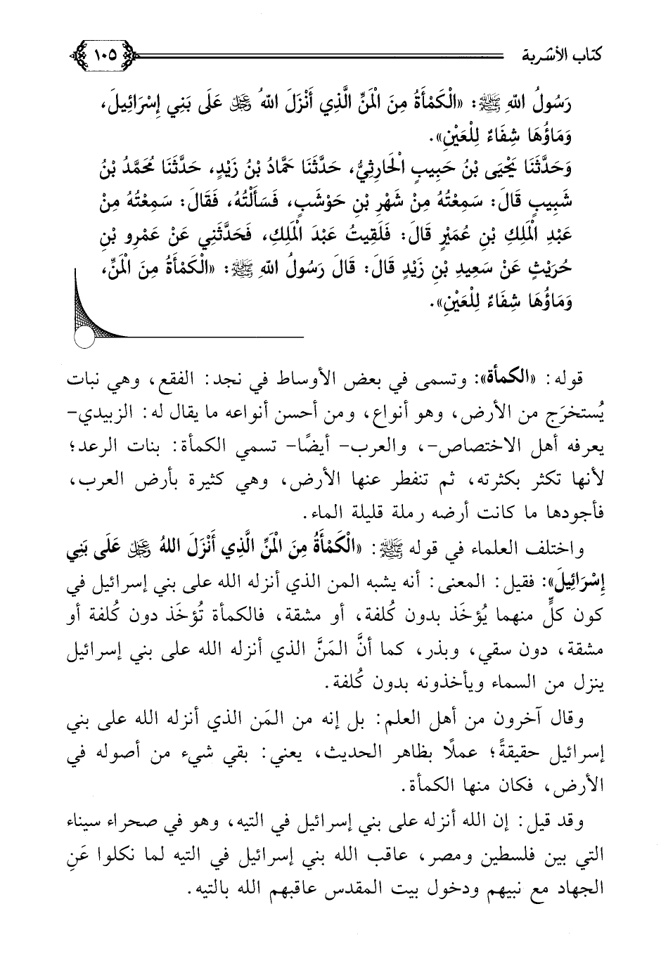 واختلف العلماء في قوله صلى الله عليه وسلم: ((الْكَمْأَةُ مِنَ الْمَنِّ الَّذِي أَنْزَلَ اللَّهُ عز وجل عَلَى بَنِي إِسْرَائِيلَ)): فقيل: المعنى: أنه يشبه المن الذي أنزله الله على بني إسرائيل في كون كلٍّ منهما يُؤخَذ بدون كُلفة، أو مشقة، فالكمأة تُؤخَذ دون كُلفة أو مشقة، دون سقي، وبذر، كما أنَّ المَنَّ الذي أنزله الله على بني إسرائيل ينزل من السماء ويأخذونه بدون كُلفة.