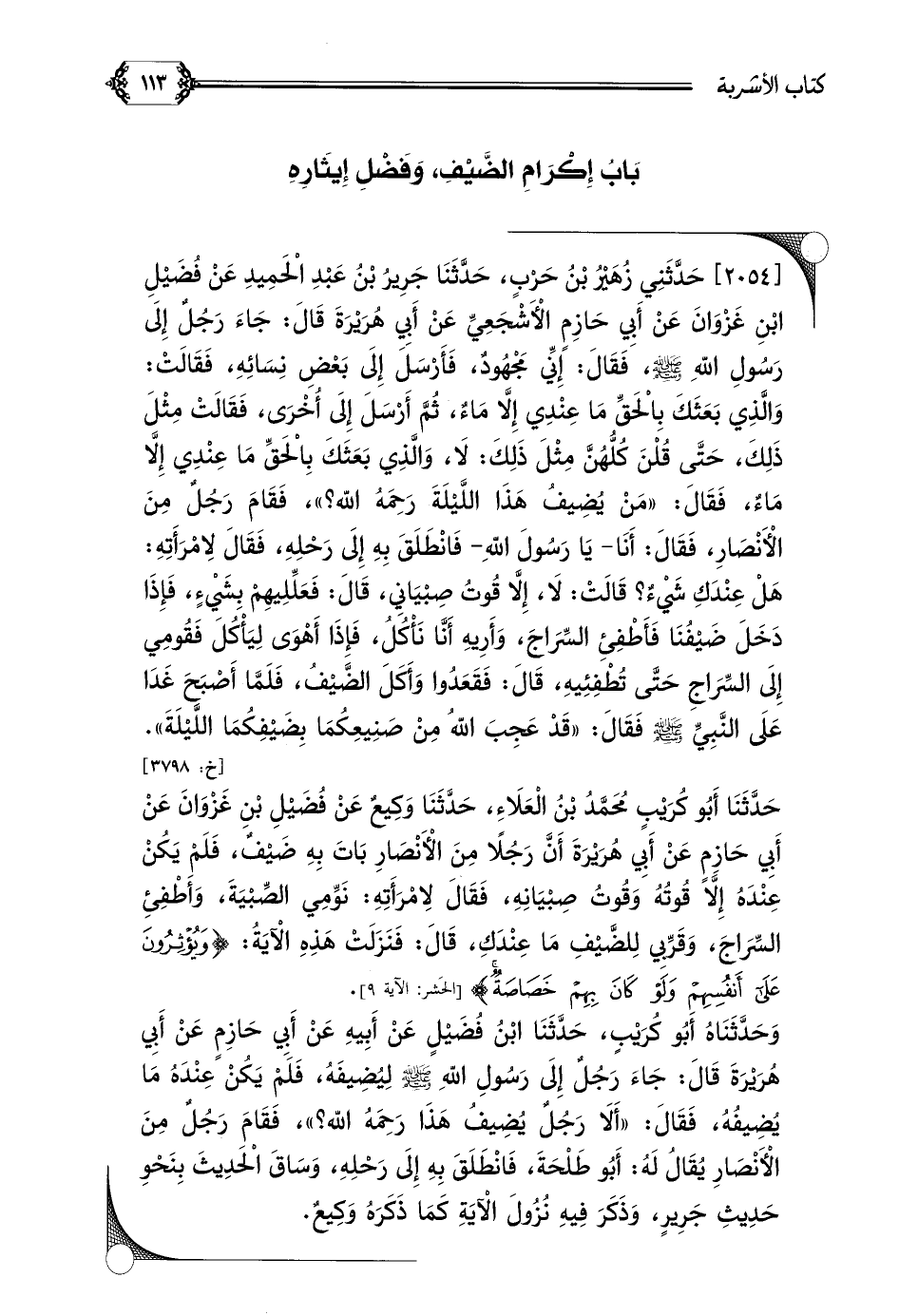 [٢٠٥٤] حَدَّثَنِي زُهَيْرُ بْنُ حَرْبٍ، حَدَّثَنَا جَرِيرُ بْنُ عَبْدِ الْحَمِيدِ عَنْ فُضَيْلِ بْنِ غَزْوَانَ عَنْ أَبِي حَازِمٍ الْأَشْجَعِيِّ عَنْ أَبِي هُرَيْرَةَ قَالَ: جَاءَ رَجُلٌ إِلَى رَسُولِ اللَّهِ صلى الله عليه وسلم، فَقَالَ: إِنِّي مَجْهُودٌ، فَأَرْسَلَ إِلَى بَعْضِ نِسَائِهِ، فَقَالَتْ: وَالَّذِي بَعَثَكَ بِالْحَقِّ مَا عِنْدِي إِلَّا مَاءٌ، ثُمَّ أَرْسَلَ إِلَى أُخْرَى، فَقَالَتْ مِثْلَ ذَلِكَ، حَتَّى قُلْنَ كُلُّهُنَّ مِثْلَ ذَلِكَ: لَا، وَالَّذِي بَعَثَكَ بِالْحَقِّ مَا عِنْدِي إِلَّا مَاءٌ، فَقَالَ: ((مَنْ يُضِيفُ هَذَا اللَّيْلَةَ رَحِمَهُ اللَّهُ؟ ))، فَقَامَ رَجُلٌ مِنْ الْأَنْصَارِ، فَقَالَ: أَنَا- يَا رَسُولَ اللَّهِ- فَانْطَلَقَ بِهِ إِلَى رَحْلِهِ، فَقَالَ لِامْرَأَتِهِ: هَلْ عِنْدَكِ شَيْءٌ؟ قَالَتْ: لَا، إِلَّا قُوتُ صِبْيَانِي، قَالَ: فَعَلِّلِيهِمْ بِشَيْءٍ، فَإِذَا دَخَلَ ضَيْفُنَا فَأَطْفِئِ السِّرَاجَ، وَأَرِيهِ أَنَّا نَأْكُلُ، فَإِذَا أَهْوَى لِيَأْكُلَ فَقُومِي إِلَى السِّرَاجِ حَتَّى تُطْفِئِيهِ، قَالَ: فَقَعَدُوا وَأَكَلَ الضَّيْفُ، فَلَمَّا أَصْبَحَ غَدَا عَلَى النَّبِيِّ صَلَّى اللَّهُ عَلَيْهِ وَسَلَّمَ فَقَالَ: ((قَدْ عَجِبَ اللَّهُ مِنْ صَنِيعِكُمَا بِضَيْفِكُمَا اللَّيْلَةَ)).
