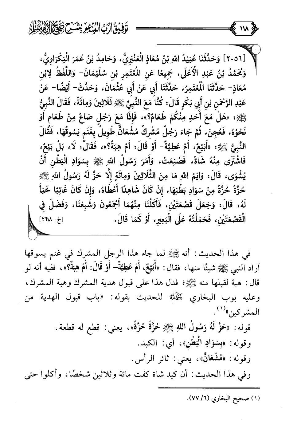 [٢٠٥٦] وَحَدَّثَنَا عُبَيْدُ اللَّهِ بْنُ مُعَاذٍ الْعَنْبَرِيُّ، وَحَامِدُ بْنُ عُمَرَ الْبَكْرَاوِيُّ، وَمُحَمَّدُ بْنُ عَبْدِ الْأَعْلَى، جَمِيعًا عَنِ المُعْتَمِرِ بْنِ سُلَيْمَانَ- وَاللَّفْظُ لِابْنِ مُعَاذٍ- حَدَّثَنَا الْمُعْتَمِرُ، حَدَّثَنَا أَبِي عَنْ أَبِي عُثْمَانَ، وَحَدَّثَ- أَيْضًا- عَنْ عَبْدِ الرَّحْمَنِ بْنِ أَبِي بَكْرٍ قَالَ: كُنَّا مَعَ النَّبِيِّ صلى الله عليه وسلم ثَلَاثِينَ وَمِائَةً، فَقَالَ النَّبِيُّ صلى الله عليه وسلم: ((هَلْ مَعَ أَحَدٍ مِنْكُمْ طَعَامٌ؟ ))، فَإِذَا مَعَ رَجُلٍ صَاعٌ مِنْ طَعَامٍ أَوْ نَحْوُهُ، فَعُجِنَ، ثُمَّ جَاءَ رَجُلٌ مُشْرِكٌ مُشْعَانٌّ طَوِيلٌ بِغَنَمٍ يَسُوقُهَا، فَقَالَ النَّبِيُّ صلى الله عليه وسلم: ((أَبَيْعٌ، أَمْ عَطِيَّةٌ- أَوْ قَالَ: أَمْ هِبَةٌ؟ ))، فَقَالَ: لَا، بَلْ بَيْعٌ، فَاشْتَرَى مِنْهُ شَاةً، فَصُنِعَتْ، وَأَمَرَ رَسُولُ اللَّهِ صلى الله عليه وسلم بِسَوَادِ الْبَطْنِ أَنْ يُشْوَى، قَالَ: وَايْمُ اللَّهِ مَا مِنَ الثَّلَاثِينَ وَمِائَةٍ إِلَّا حَزَّ لَهُ رَسُولُ اللَّهِ صلى الله عليه وسلم حُزَّةً حُزَّةً مِنْ سَوَادِ بَطْنِهَا، إِنْ كَانَ شَاهِدًا أَعْطَاهُ، وَإِنْ كَانَ غَائِبًا خَبَأَ لَهُ، قَالَ: وَجَعَلَ قَصْعَتَيْنِ، فَأَكَلْنَا مِنْهُمَا أَجْمَعُونَ وَشَبِعْنَا، وَفَضَلَ فِي الْقَصْعَتَيْنِ، فَحَمَلْتُهُ عَلَى الْبَعِيرِ، أَوْ كَمَا قَالَ.
