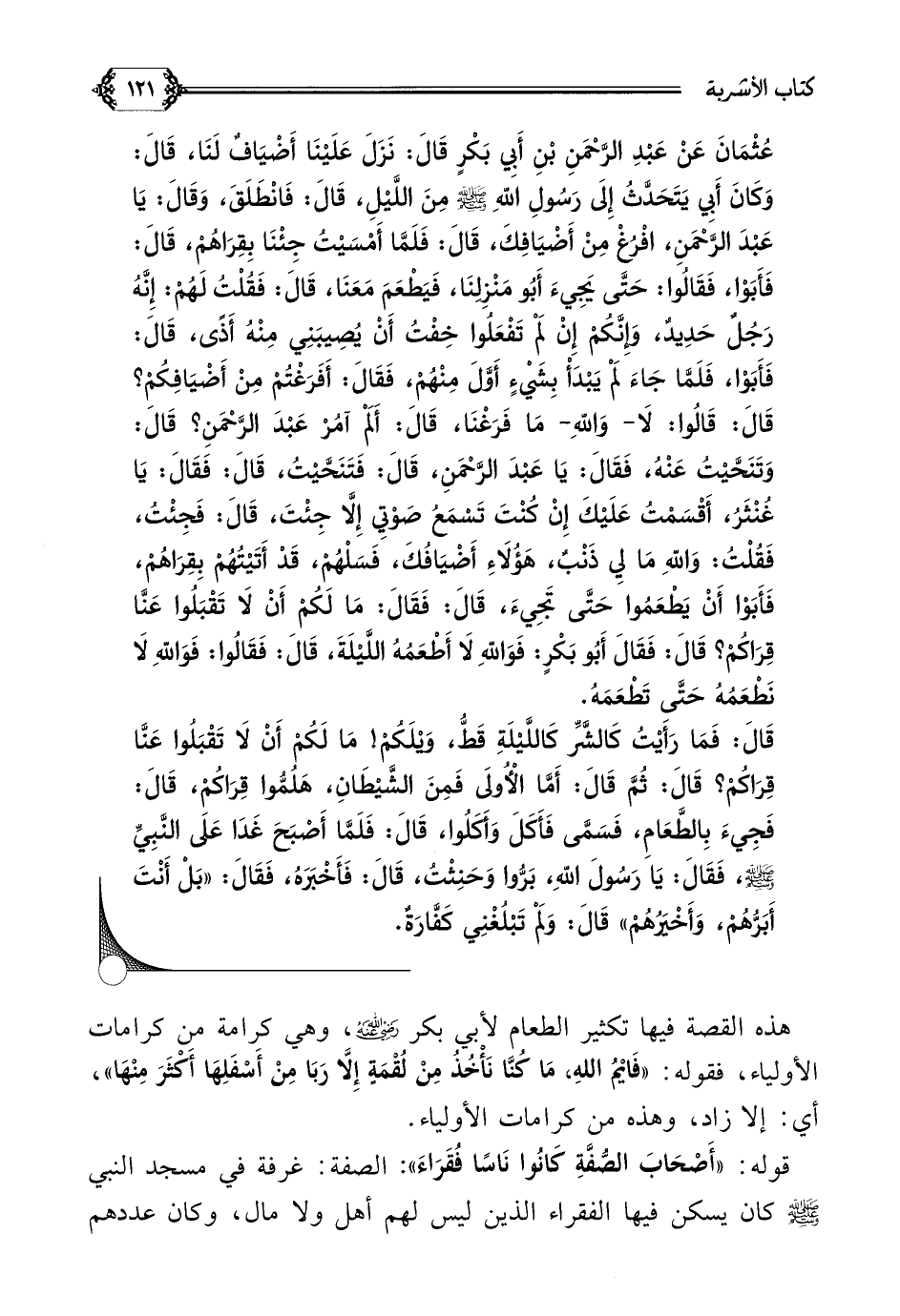 عُثْمَانَ عَنْ عَبْدِ الرَّحْمَنِ بْنِ أَبِي بَكْرٍ قَالَ: نَزَلَ عَلَيْنَا أَضْيَافٌ لَنَا، قَالَ: وَكَانَ أَبِي يَتَحَدَّثُ إِلَى رَسُولِ اللَّهِ صلى الله عليه وسلم مِنَ اللَّيْلِ، قَالَ: فَانْطَلَقَ، وَقَالَ: يَا عَبْدَ الرَّحْمَنِ، افْرُغْ مِنْ أَضْيَافِكَ، قَالَ: فَلَمَّا أَمْسَيْتُ جِئْنَا بِقِرَاهُمْ، قَالَ: فَأَبَوْا، فَقَالُوا: حَتَّى يَجِيءَ أَبُو مَنْزِلِنَا، فَيَطْعَمَ مَعَنَا، قَالَ: فَقُلْتُ لَهُمْ: إِنَّهُ رَجُلٌ حَدِيدٌ، وَإِنَّكُمْ إِنْ لَمْ تَفْعَلُوا خِفْتُ أَنْ يُصِيبَنِي مِنْهُ أَذًى، قَالَ: فَأَبَوْا، فَلَمَّا جَاءَ لَمْ يَبْدَأْ بِشَيْءٍ أَوَّلَ مِنْهُمْ، فَقَالَ: أَفَرَغْتُمْ مِنْ أَضْيَافِكُمْ؟ قَالَ: قَالُوا: لَا- وَاللَّهِ- مَا فَرَغْنَا، قَالَ: أَلَمْ آمُرْ عَبْدَ الرَّحْمَنِ؟ قَالَ: وَتَنَحَّيْتُ عَنْهُ، فَقَالَ: يَا عَبْدَ الرَّحْمَنِ، قَالَ: فَتَنَحَّيْتُ، قَالَ: فَقَالَ: يَا غُنْثَرُ، أَقْسَمْتُ عَلَيْكَ إِنْ كُنْتَ تَسْمَعُ صَوْتِي إِلَّا جِئْتَ، قَالَ: فَجِئْتُ، فَقُلْتُ: وَاللَّهِ مَا لِي ذَنْبٌ، هَؤُلَاءِ أَضْيَافُكَ، فَسَلْهُمْ، قَدْ أَتَيْتُهُمْ بِقِرَاهُمْ، فَأَبَوْا أَنْ يَطْعَمُوا حَتَّى تَجِيءَ، قَالَ: فَقَالَ: مَا لَكُمْ أَنْ لَا تَقْبَلُوا عَنَّا قِرَاكُمْ؟ قَالَ: فَقَالَ أَبُو بَكْرٍ: فَوَاللَّهِ لَا أَطْعَمُهُ اللَّيْلَةَ، قَالَ: فَقَالُوا: فَوَاللَّهِ لَا نَطْعَمُهُ حَتَّى تَطْعَمَهُ.