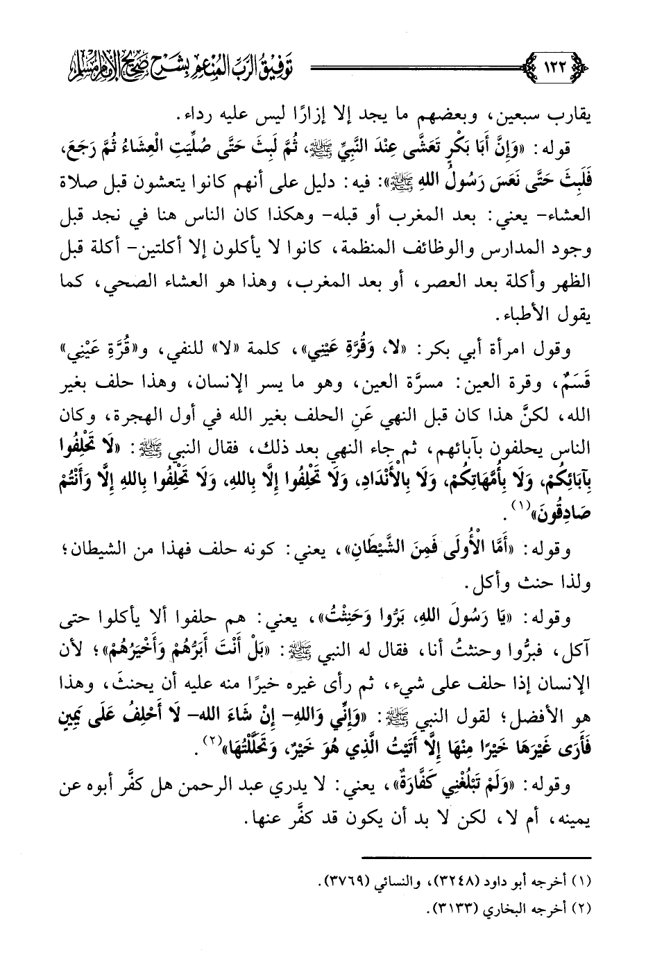 قوله: ((وَإِنَّ أَبَا بَكْرٍ تَعَشَّى عِنْدَ النَّبِيِّ صلى الله عليه وسلم، ثُمَّ لَبِثَ حَتَّى صُلِّيَتِ الْعِشَاءُ ثُمَّ رَجَعَ، فَلَبِثَ حَتَّى نَعَسَ رَسُولُ اللَّهِ صلى الله عليه وسلم)): فيه: دليل على أنهم كانوا يتعشون قبل صلاة العشاء- يعني: بعد المغرب أو قبله- وهكذا كان الناس هنا في نجد قبل وجود المدارس والوظائف المنظمة، كانوا لا يأكلون إلا أكلتين- أكلة قبل الظهر وأكلة بعد العصر، أو بعد المغرب، وهذا هو العشاء الصحي، كما يقول الأطباء.