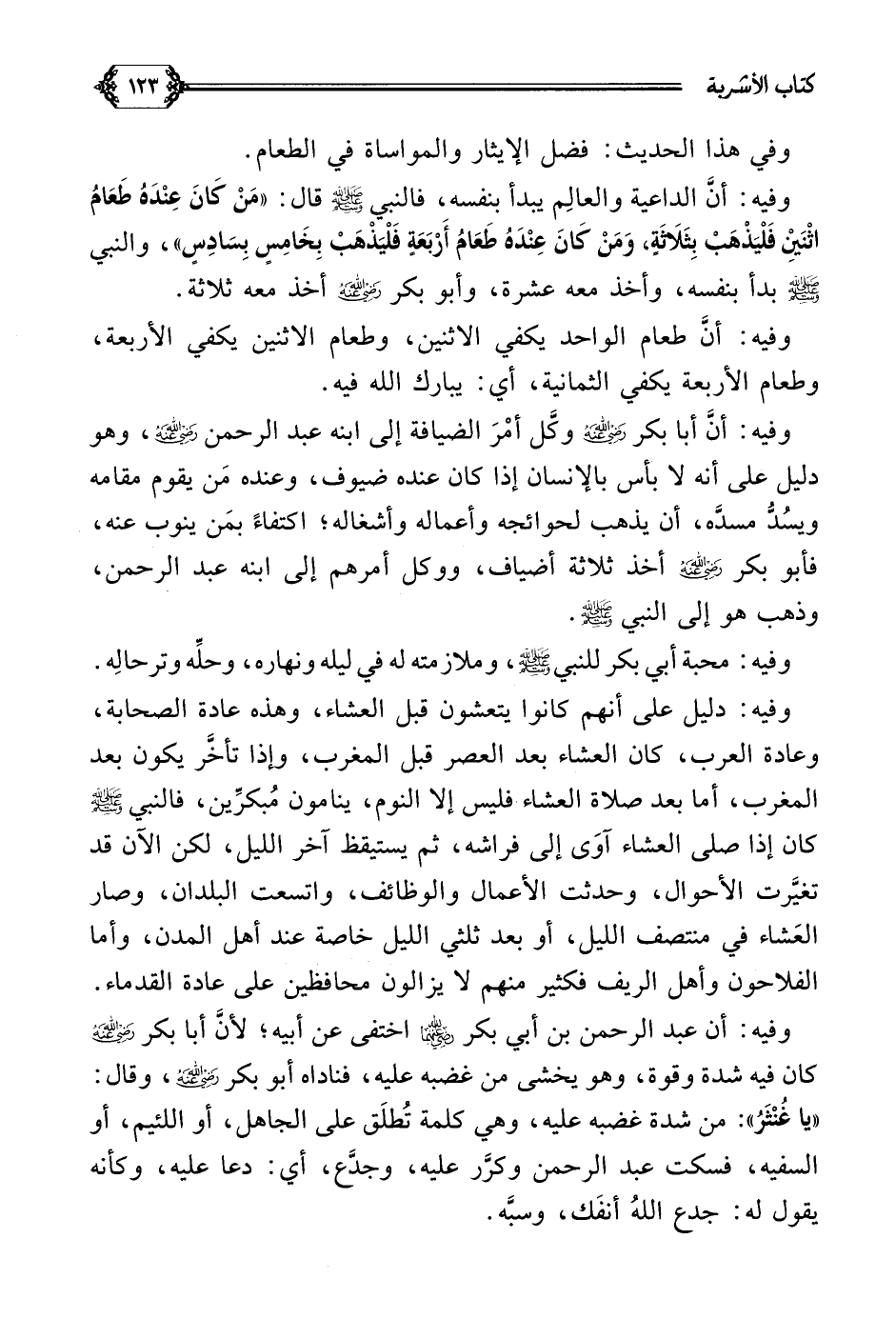 وفيه: أنَّ أبا بكر رضي الله عنه وكَّل أمْرَ الضيافة إلى ابنه عبد الرحمن رضي الله عنه، وهو دليل على أنه لا بأس بالإنسان إذا كان عنده ضيوف، وعنده مَن يقوم مقامه ويسُدُّ مسدَّه، أن يذهب لحوائجه وأعماله وأشغاله؛ اكتفاءً بمَن ينوب عنه، فأبو بكر رضي الله عنه أخذ ثلاثة أضياف، ووكل أمرهم إلى ابنه عبد الرحمن، وذهب هو إلى النبي صلى الله عليه وسلم.