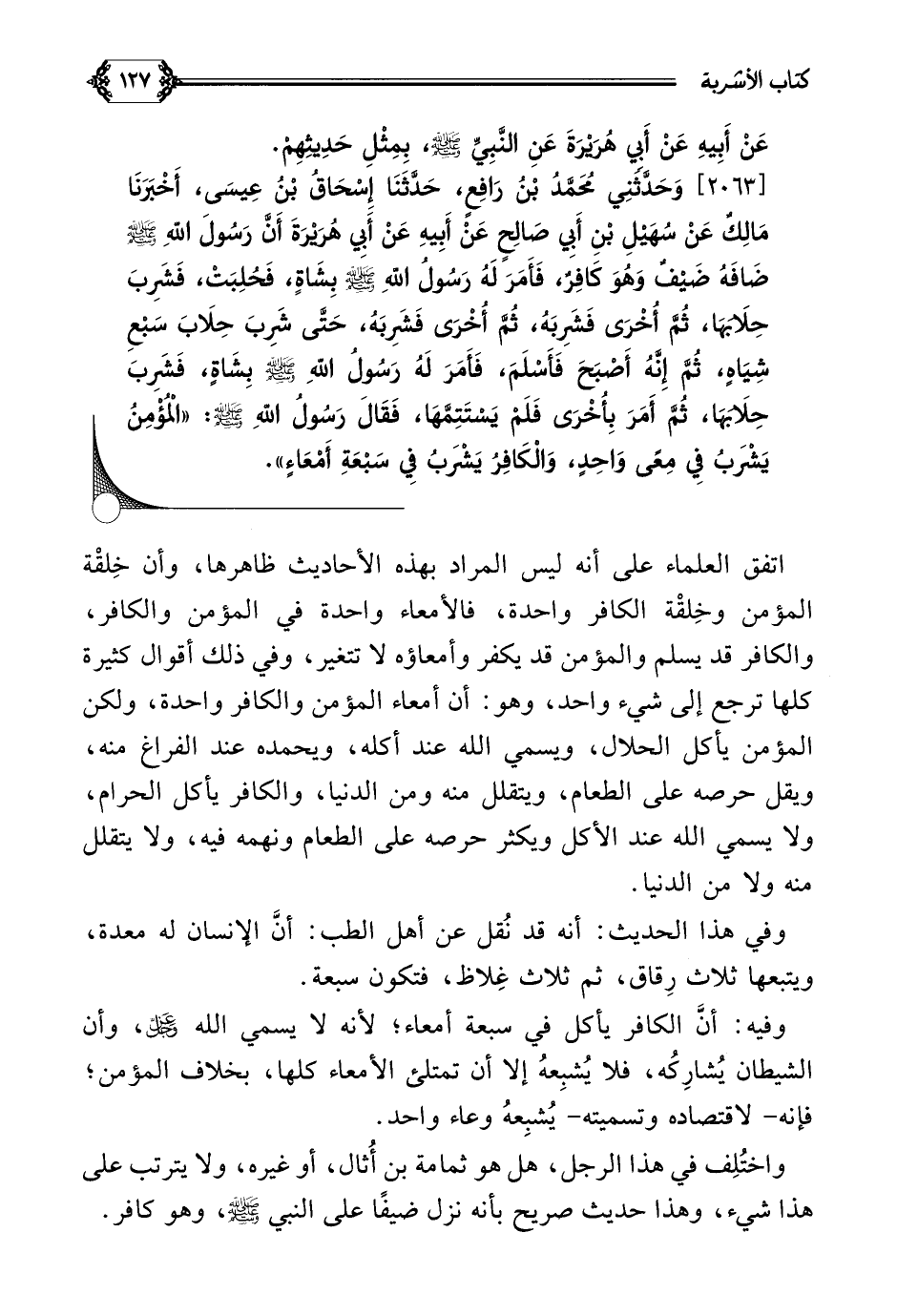 [٢٠٦٣] وَحَدَّثَنِي مُحَمَّدُ بْنُ رَافِعٍ، حَدَّثَنَا إِسْحَاقُ بْنُ عِيسَى، أَخْبَرَنَا مَالِكٌ عَنْ سُهَيْلِ بْنِ أَبِي صَالِحٍ عَنْ أَبِيهِ عَنْ أَبِي هُرَيْرَةَ أَنَّ رَسُولَ اللَّهِ صلى الله عليه وسلم ضَافَهُ ضَيْفٌ وَهُوَ كَافِرٌ، فَأَمَرَ لَهُ رَسُولُ اللَّهِ صلى الله عليه وسلم بِشَاةٍ، فَحُلِبَتْ، فَشَرِبَ حِلَابَهَا، ثُمَّ أُخْرَى فَشَرِبَهُ، ثُمَّ أُخْرَى فَشَرِبَهُ، حَتَّى شَرِبَ حِلَابَ سَبْعِ شِيَاهٍ، ثُمَّ إِنَّهُ أَصْبَحَ فَأَسْلَمَ، فَأَمَرَ لَهُ رَسُولُ اللَّهِ صلى الله عليه وسلم بِشَاةٍ، فَشَرِبَ حِلَابَهَا، ثُمَّ أَمَرَ بِأُخْرَى فَلَمْ يَسْتَتِمَّهَا، فَقَالَ رَسُولُ اللَّهِ صلى الله عليه وسلم: ((الْمُؤْمِنُ يَشْرَبُ فِي مِعًى وَاحِدٍ، وَالْكَافِرُ يَشْرَبُ فِي سَبْعَةِ أَمْعَاءٍ)).