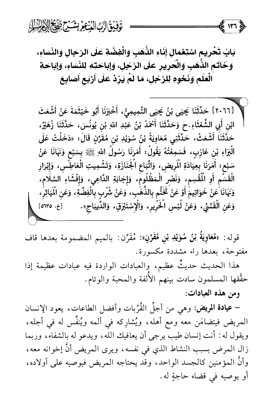 [٢٠٦٦] حَدَّثَنَا يَحيَى بْنُ يَحيَى التَّمِيمِيُّ، أَخْبَرَنَا أَبُو خَيْثَمَةَ عَنْ أَشْعَثَ بْنِ أَبِي الشَّعْثَاءِ. ح وَحَدَّثَنَا أَحْمَدُ بْنُ عَبْدِ اللَّهِ بْنِ يُونُسَ، حَدَّثَنَا زُهَيْرٌ، حَدَّثَنَا أَشْعَثُ، حَدَّثَنِي مُعَاوِيَةُ بْنُ سُوَيْدِ بْنِ مُقَرِّنٍ قَالَ: ((دَخَلْتُ عَلَى الْبَرَاءِ بْنِ عَازِبٍ، فَسَمِعْتُهُ يَقُولُ: أَمَرَنَا رَسُولُ اللَّهِ صلى الله عليه وسلم بِسَبْعٍ وَنَهَانَا عَنْ سَبْعٍ: أَمَرَنَا بِعِيَادَةِ الْمَرِيضِ، وَاتِّبَاعِ الْجَنَازَةِ، وَتَشْمِيتِ الْعَاطِسِ، وَإِبْرَارِ الْقَسَمِ أَوِ الْمُقْسِمِ، وَنَصْرِ الْمَظْلُومِ، وَإِجَابَةِ الدَّاعِي، وَإِفْشَاءِ السَّلَامِ، وَنَهَانَا عَنْ خَوَاتِيمَ أَوْ عَنْ تَخَتُّمٍ بِالذَّهَبِ، وَعَنْ شُرْبٍ بِالْفِضَّةِ، وَعَنِ الْمَيَاثِرِ، وَعَنِ الْقَسِّيِّ، وَعَنْ لُبْسِ الْحَرِيرِ، وَالْإِسْتَبْرَقِ، وَالدِّيبَاجِ)).