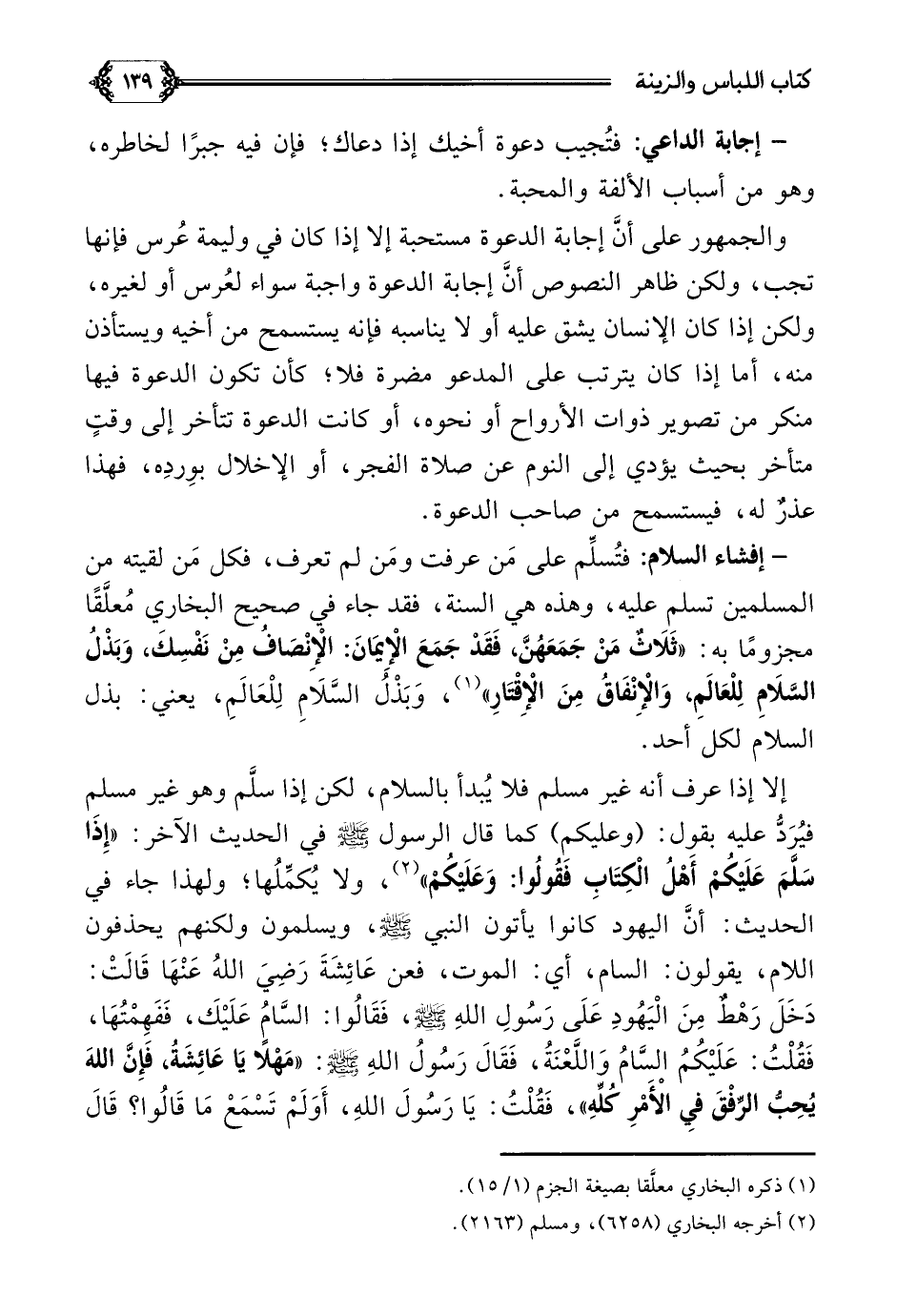 إفشاء السلام: فتُسلِّم على مَن عرفت ومَن لم تعرف، فكل مَن لقيته من المسلمين تسلم عليه، وهذه هي السنة، فقد جاء في صحيح البخاري مُعلَّقًا مجزومًا به: ((ثَلَاثٌ مَنْ جَمَعَهُنَّ، فَقَدْ جَمَعَ الْإِيمَانَ: الْإِنْصَافُ مِنْ نَفْسِكَ، وَبَذْلُ السَّلَامِ لِلْعَالَمِ، وَالْإِنْفَاقُ مِنَ الْإِقْتَارِ)) (¬١)، وَبَذْلُ السَّلَامِ لِلْعَالَمِ، يعني: بذل السلام لكل أحد.
