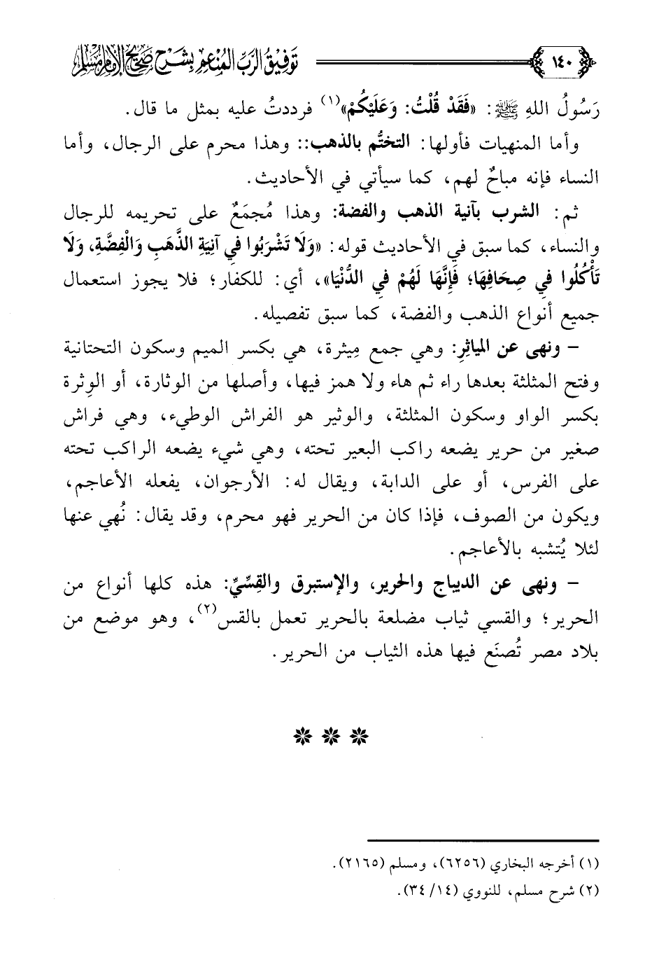 ونهى عن المياثِرِ: وهي جمع مِيثرة، هي بكسر الميم وسكون التحتانية وفتح المثلثة بعدها راء ثم هاء ولا همز فيها، وأصلها من الوثارة، أو الوِثرة بكسر الواو وسكون المثلثة، والوثير هو الفراش الوطيء، وهي فراش صغير من حرير يضعه راكب البعير تحته، وهي شيء يضعه الراكب تحته على الفرس، أو على الدابة، ويقال له: الأرجوان، يفعله الأعاجم، ويكون من الصوف، فإذا كان من الحرير فهو محرم، وقد يقال: نُهي عنها لئلا يُتشبه بالأعاجم.