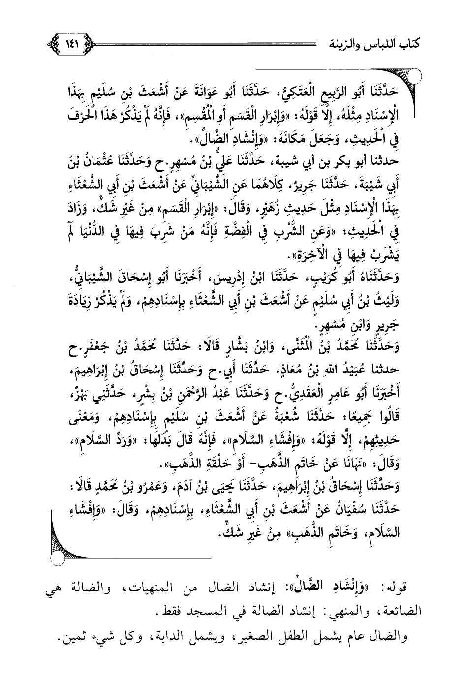 حدثنا أبو بكر بن أبي شيبة، حَدَّثَنَا عَلِيُّ بْنُ مُسْهِرٍ. ح وَحَدَّثَنَا عُثْمَانُ بْنُ أَبِي شَيْبَةَ، حَدَّثَنَا جَرِيرٌ، كِلَاهُمَا عَنِ الشَّيْبَانِيِّ عَنْ أَشْعَثَ بْنِ أَبِي الشَّعْثَاءِ بِهَذَا الْإِسْنَادِ مِثْلَ حَدِيثِ زُهَيْرٍ، وَقَالَ: ((إِبْرَارِ الْقَسَمِ)) مِنْ غَيْرِ شَكٍّ، وَزَادَ فِي الْحَدِيثِ: ((وَعَنِ الشُّرْبِ فِي الْفِضَّةِ فَإِنَّهُ مَنْ شَرِبَ فِيهَا فِي الدُّنْيَا لَمْ يَشْرَبْ فِيهَا فِي الْآخِرَةِ)).