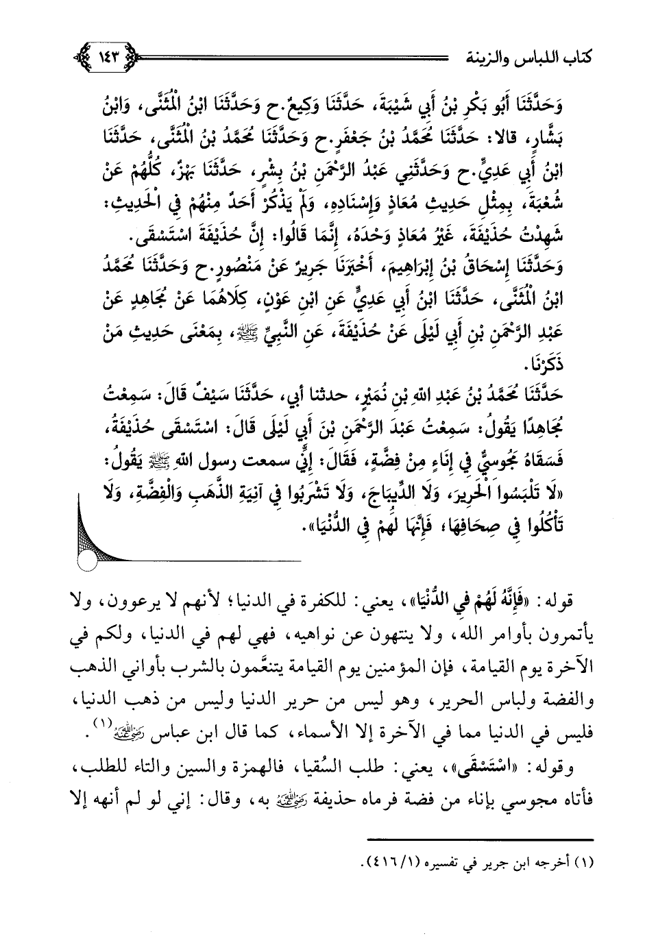 حَدَّثَنَا مُحَمَّدُ بْنُ عَبْدِ اللَّهِ بْنِ نُمَيْرٍ، حدثنا أبي، حَدَّثَنَا سَيْفٌ قَالَ: سَمِعْتُ مُجَاهِدًا يَقُولُ: سَمِعْتُ عَبْدَ الرَّحْمَنِ بْنَ أَبِي لَيْلَى قَالَ: اسْتَسْقَى حُذَيْفَةُ، فَسَقَاهُ مَجُوسِيٌّ فِي إِنَاءٍ مِنْ فِضَّةٍ، فَقَالَ: إِنِّي سمعت رسول اللَّهِ صلى الله عليه وسلم يَقُولُ: ((لَا تَلْبَسُوا الْحَرِيرَ، وَلَا الدِّيبَاجَ، وَلَا تَشْرَبُوا فِي آنِيَةِ الذَّهَبِ وَالْفِضَّةِ، وَلَا تَأْكُلُوا فِي صِحَافِهَا؛ فَإِنَّهَا لَهُمْ فِي الدُّنْيَا)).