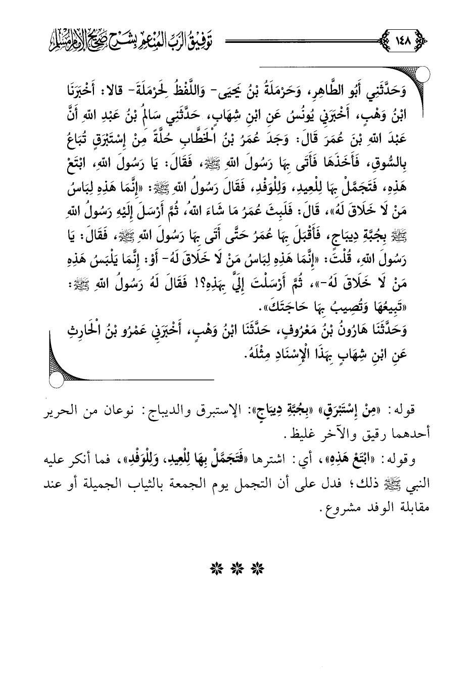 وَحَدَّثَنِي أَبُو الطَّاهِرِ، وَحَرْمَلَةُ بْنُ يَحيَى- وَاللَّفْظُ لِحَرْمَلَةَ- قالا: أَخْبَرَنَا ابْنُ وَهْبٍ، أَخْبَرَنِي يُونُسُ عَنِ ابْنِ شِهَابٍ، حَدَّثَنِي سَالِمُ بْنُ عَبْدِ اللَّهِ أَنَّ عَبْدَ اللَّهِ بْنَ عُمَرَ قَالَ: وَجَدَ عُمَرُ بْنُ الْخَطَّابِ حُلَّةً مِنْ إِسْتَبْرَقٍ تُبَاعُ بِالسُّوقِ، فَأَخَذَهَا فَأَتَى بِهَا رَسُولَ اللَّهِ صلى الله عليه وسلم، فَقَالَ: يَا رَسُولَ اللَّهِ، ابْتَعْ هَذِهِ، فَتَجَمَّلْ بِهَا لِلْعِيدِ، وَلِلْوَفْدِ، فَقَالَ رَسُولُ اللَّهِ صلى الله عليه وسلم: ((إِنَّمَا هَذِهِ لِبَاسُ مَنْ لَا خَلَاقَ لَهُ))، قَالَ: فَلَبِثَ عُمَرُ مَا شَاءَ اللَّهُ، ثُمَّ أَرْسَلَ إِلَيْهِ رَسُولُ اللَّهِ صلى الله عليه وسلم بِجُبَّةِ دِيبَاجٍ، فَأَقْبَلَ بِهَا عُمَرُ حَتَّى أَتَى بِهَا رَسُولَ اللَّهِ صلى الله عليه وسلم، فَقَالَ: يَا رَسُولَ اللَّهِ، قُلْتَ: ((إِنَّمَا هَذِهِ لِبَاسُ مَنْ لَا خَلَاقَ لَهُ- أَوْ: إِنَّمَا يَلْبَسُ هَذِهِ مَنْ لَا خَلَاقَ لَهُ-))، ثُمَّ أَرْسَلْتَ إِلَيَّ بِهَذِهِ؟ ! فَقَالَ لَهُ رَسُولُ اللَّهِ صلى الله عليه وسلم: ((تَبِيعُهَا وَتُصِيبُ بِهَا حَاجَتَكَ)).