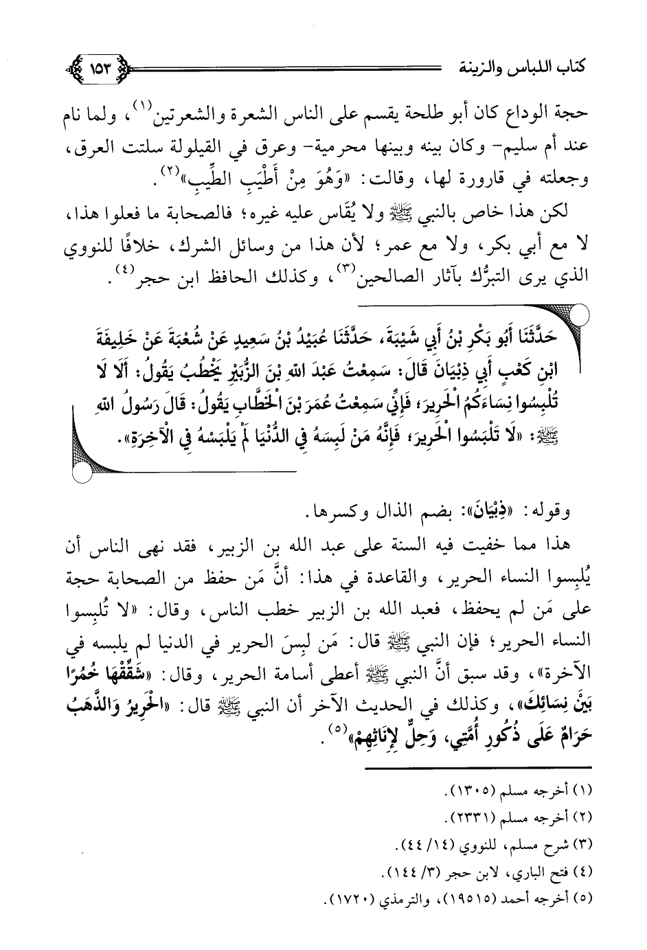 هذا مما خفيت فيه السنة على عبد الله بن الزبير، فقد نهى الناس أن يُلبِسوا النساء الحرير، والقاعدة في هذا: أنَّ مَن حفظ من الصحابة حجة على مَن لم يحفظ، فعبد الله بن الزبير خطب الناس، وقال: ((لا تُلبِسوا النساء الحرير؛ فإن النبي صلى الله عليه وسلم قال: مَن لبِسَ الحرير في الدنيا لم يلبسه في الآخرة))، وقد سبق أنَّ النبي صلى الله عليه وسلم أعطى أسامة الحرير، وقال: ((شَقِّقْهَا خُمُرًا بَيْنَ نِسَائِكَ))، وكذلك في الحديث الآخر أن النبي صلى الله عليه وسلم قال: ((الْحَرِيرُ وَالذَّهَبُ حَرَامٌ عَلَى ذُكُورِ أُمَّتِي، وَحِلٌّ لِإِنَاثِهِمْ)) (¬٥).