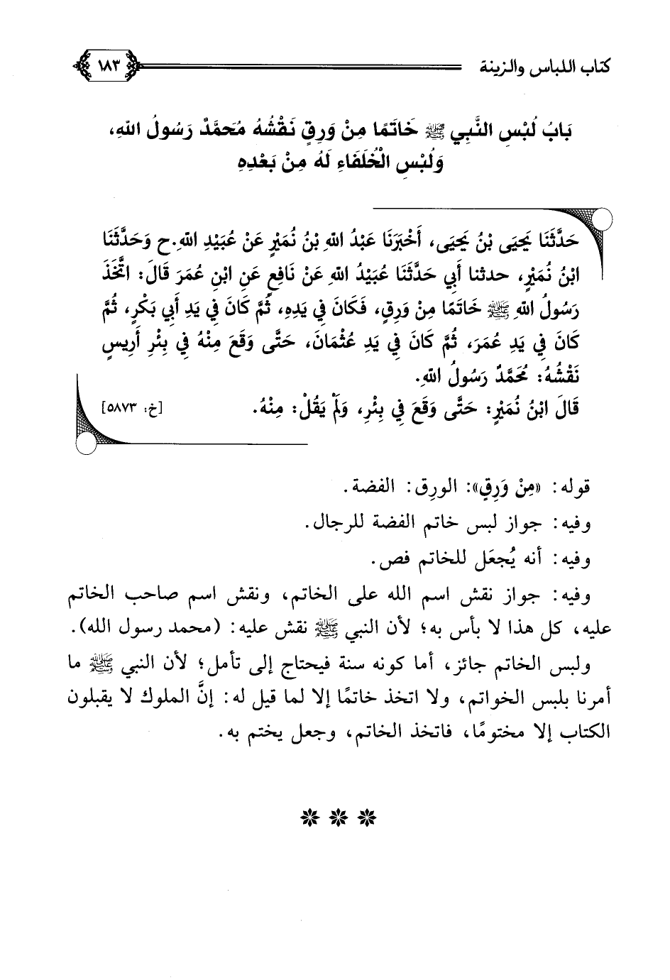 بَابُ لُبْسِ النَّبِيِّ صلى الله عليه وسلم خَاتَمًا مِنْ وَرِقٍ نَقْشُهُ مُحَمَّدٌ رَسُولُ اللَّهِ، وَلُبْسِ الْخُلَفَاءِ لَهُ مِنْ بَعْدِهِ