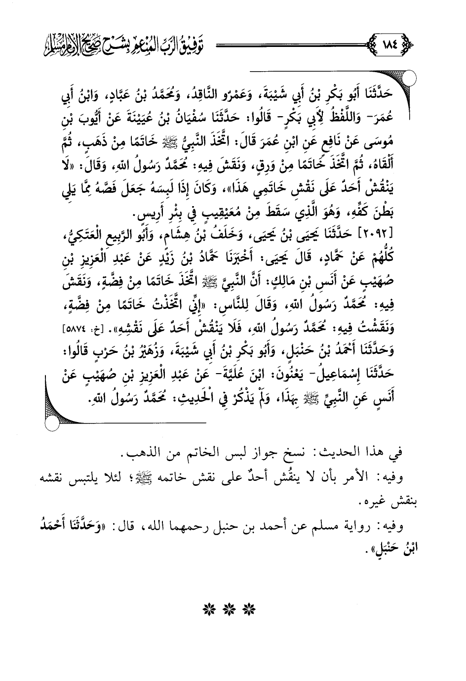 [٢٠٩٢] حَدَّثَنَا يَحيَى بْنُ يَحيَى، وَخَلَفُ بْنُ هِشَامٍ، وَأَبُو الرَّبِيعِ الْعَتَكِيُّ، كُلُّهُمْ عَنْ حَمَّادٍ، قَالَ يَحيَى: أَخْبَرَنَا حَمَّادُ بْنُ زَيْدٍ عَنْ عَبْدِ الْعَزِيزِ بْنِ صُهَيْبٍ عَنْ أَنَسِ بْنِ مَالِكٍ: أَنَّ النَّبِيَّ صلى الله عليه وسلم اتَّخَذَ خَاتَمًا مِنْ فِضَّةٍ، وَنَقَشَ فِيهِ: مُحَمَّدٌ رَسُولُ اللَّهِ، وَقَالَ لِلنَّاسِ: ((إِنِّي اتَّخَذْتُ خَاتَمًا مِنْ فِضَّةٍ، وَنَقَشْتُ فِيهِ: مُحَمَّدٌ رَسُولُ اللَّهِ، فَلَا يَنْقُشْ أَحَدٌ عَلَى نَقْشِهِ)).