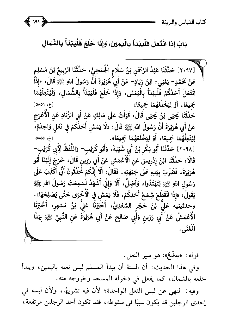[٢٠٩٧] حَدَّثَنَا عَبْدُ الرَّحْمَنِ بْنُ سَلَّامٍ الْجُمَحِيُّ، حَدَّثَنَا الرَّبِيعُ بْنُ مُسْلِمٍ عَنْ مُحَمَّدٍ- يَعْنِي: ابْنَ زِيَادٍ- عَنْ أَبِي هُرَيْرَةَ أَنَّ رَسُولَ اللَّهِ صلى الله عليه وسلم قَالَ: ((إِذَا انْتَعَلَ أَحَدُكُمْ فَلْيَبْدَأْ بِالْيُمْنَى، وَإِذَا خَلَعَ فَلْيَبْدَأْ بِالشِّمَالِ، وَلْيُنْعِلْهُمَا جَمِيعًا، أَوْ لِيَخْلَعْهُمَا جَمِيعًا)).