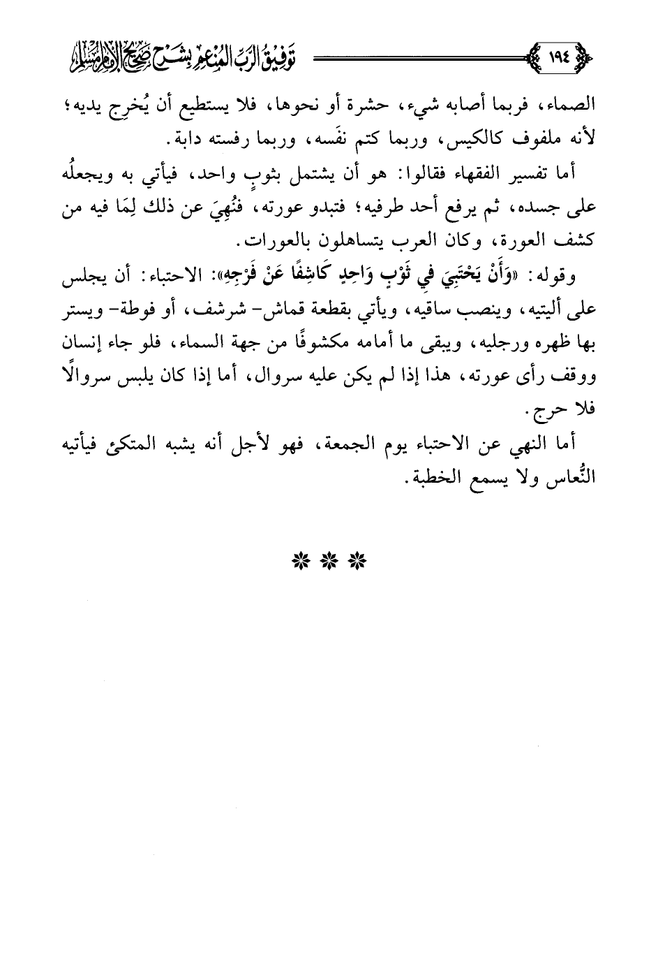 وقوله: ((وَأَنْ يَحْتَبِيَ فِي ثَوْبٍ وَاحِدٍ كَاشِفًا عَنْ فَرْجِهِ)): الاحتباء: أن يجلس على أليتيه، وينصب ساقيه، ويأتي بقطعة قماش- شرشف، أو فوطة- ويستر بها ظهره ورجليه، ويبقى ما أمامه مكشوفًا من جهة السماء، فلو جاء إنسان ووقف رأى عورته، هذا إذا لم يكن عليه سروال، أما إذا كان يلبس سروالًا فلا حرج.