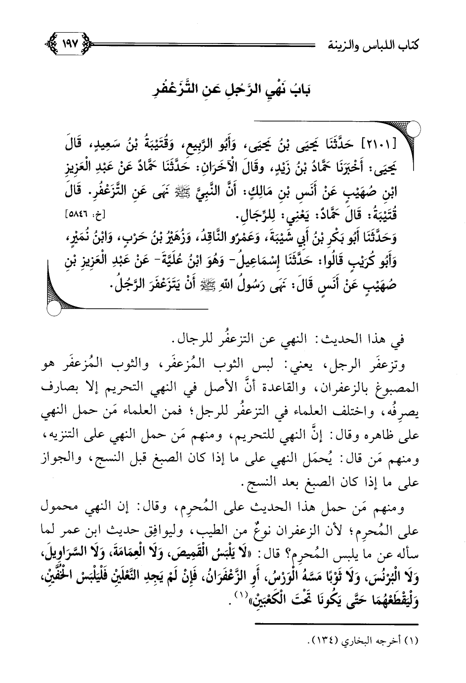 [٢١٠١] حَدَّثَنَا يَحيَى بْنُ يَحيَى، وَأَبُو الرَّبِيعِ، وَقُتَيْبَةُ بْنُ سَعِيدٍ، قَالَ يَحيَى: أَخْبَرَنَا حَمَّادُ بْنُ زَيْدٍ، وقَالَ الْآخَرَانِ: حَدَّثَنَا حَمَّادٌ عَنْ عَبْدِ الْعَزِيزِ بْنِ صُهَيْبٍ عَنْ أَنَسِ بْنِ مَالِكٍ: أَنَّ النَّبِيَّ صلى الله عليه وسلم نَهَى عَنِ التَّزَعْفُرِ. قَالَ قُتَيْبَةُ: قَالَ حَمَّادٌ: يَعْنِي: لِلرِّجَالِ.