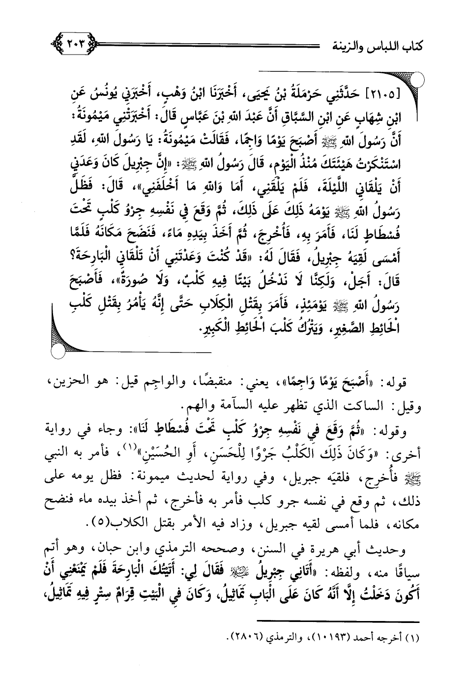 [٢١٠٥] حَدَّثَنِي حَرْمَلَةُ بْنُ يَحيَى، أَخْبَرَنَا ابْنُ وَهْبٍ، أَخْبَرَنِي يُونُسُ عَنِ ابْنِ شِهَابٍ عَنِ ابْنِ السَّبَّاقِ أَنَّ عَبْدَ اللَّهِ بْنَ عَبَّاسٍ قَالَ: أَخْبَرَتْنِي مَيْمُونَةُ: أَنَّ رَسُولَ اللَّهِ صلى الله عليه وسلم أَصْبَحَ يَوْمًا وَاجِمًا، فَقَالَتْ مَيْمُونَةُ: يَا رَسُولَ اللَّهِ، لَقَدِ اسْتَنْكَرْتُ هَيْئَتَكَ مُنْذُ الْيَوْمِ، قَالَ رَسُولُ اللَّهِ صلى الله عليه وسلم: ((إِنَّ جِبْرِيلَ كَانَ وَعَدَنِي أَنْ يَلْقَانِي اللَّيْلَةَ، فَلَمْ يَلْقَنِي، أَمَا وَاللَّهِ مَا أَخْلَفَنِي))، قَالَ: فَظَلَّ رَسُولُ اللَّهِ صلى الله عليه وسلم يَوْمَهُ ذَلِكَ عَلَى ذَلِكَ، ثُمَّ وَقَعَ فِي نَفْسِهِ جِرْوُ كَلْبٍ تَحْتَ فُسْطَاطٍ لَنَا، فَأَمَرَ بِهِ، فَأُخْرِجَ، ثُمَّ أَخَذَ بِيَدِهِ مَاءً، فَنَضَحَ مَكَانَهُ فَلَمَّا أَمْسَى لَقِيَهُ جِبْرِيلُ، فَقَالَ لَهُ: ((قَدْ كُنْتَ وَعَدْتَنِي أَنْ تَلْقَانِي الْبَارِحَةَ؟ قَالَ: أَجَلْ، وَلَكِنَّا لَا نَدْخُلُ بَيْتًا فِيهِ كَلْبٌ، وَلَا صُورَةٌ))، فَأَصْبَحَ رَسُولُ اللَّهِ صلى الله عليه وسلم يَوْمَئِذٍ، فَأَمَرَ بِقَتْلِ الْكِلَابِ حَتَّى إِنَّهُ يَأْمُرُ بِقَتْلِ كَلْبِ الْحَائِطِ الصَّغِيرِ، وَيَتْرُكُ كَلْبَ الْحَائِطِ الْكَبِيرِ.