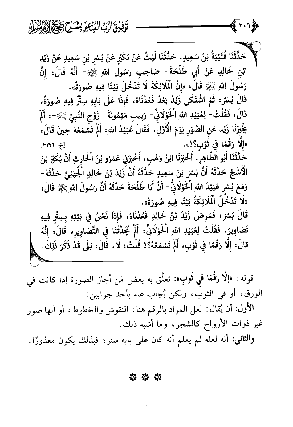 قَالَ بُسْرٌ: ثُمَّ اشْتَكَى زَيْدٌ بَعْدُ فَعُدْنَاهُ، فَإِذَا عَلَى بَابِهِ سِتْرٌ فِيهِ صُورَةٌ، قَالَ: فَقُلْتُ- لِعُبَيْدِ اللَّهِ الْخَوْلَانِيِّ- رَبِيبِ مَيْمُونَةَ- زَوْجِ النَّبِيِّ صلى الله عليه وسلم-: أَلَمْ يُخْبِرْنَا زَيْد عَنِ الصُّوَرِ يَوْمَ الْأَوَّلِ، فَقَالَ عُبَيْدُ اللَّهِ: أَلَمْ تَسْمَعْهُ حِينَ قَالَ: ((إِلَّا رَقْمًا فِي ثَوْبٍ؟ ! )).