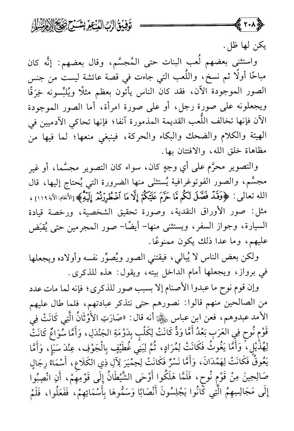 واستثنى بعضهم لُعب البنات حتى المُجسَّم، وقال بعضهم: إنَّه كان مباحًا أولًا ثم نسخ، واللُعب التي جاءت في قصة عائشة ليست من جنس الصور الموجودة الآن، فقد كان الناس يأتون بعظم مثلًا ويُلبِّسونه خِرَقًا ويجعلونه على صورة رجل، أو على صورة امرأة، أما الصور الموجودة الآن فإنها تخالف اللُّعب القديمة المذمورة آنفا؛ فإنها تحاكي الآدميين في الهيئة والكلام والضحك والبكاء والحركة، فينبغي منعها؛ لما فيها من مظاهاة خلق الله، والافتتان بها.