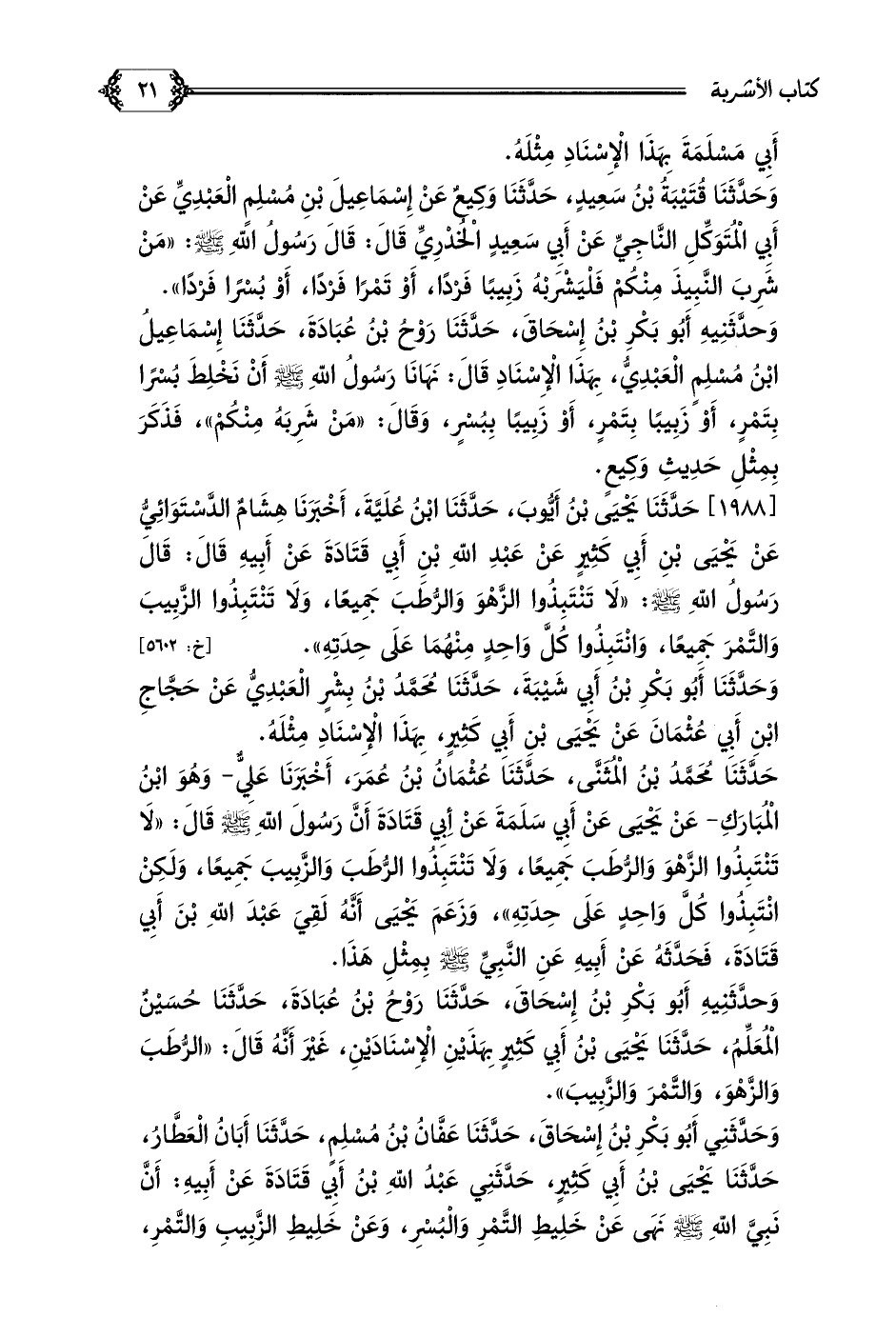 [١٩٨٨] حَدَّثَنَا يَحْيَى بْنُ أَيُّوبَ، حَدَّثَنَا ابْنُ عُلَيَّةَ، أَخْبَرَنَا هِشَامٌ الدَّسْتَوَائِيُّ عَنْ يَحْيَى بْنِ أَبِي كَثِيرٍ عَنْ عَبْدِ اللَّهِ بْنِ أَبِي قَتَادَةَ عَنْ أَبِيهِ قَالَ: قَالَ رَسُولُ اللَّهِ صلى الله عليه وسلم: ((لَا تَنْتَبِذُوا الزَّهْوَ وَالرُّطَبَ جَمِيعًا، وَلَا تَنْتَبِذُوا الزَّبِيبَ وَالتَّمْرَ جَمِيعًا، وَانْتَبِذُوا كُلَّ وَاحِدٍ مِنْهُمَا عَلَى حِدَتِهِ)).