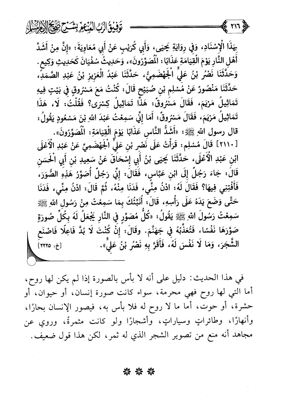 [٢١١٠] قَالَ مُسْلِم: قَرَأْتُ عَلَى نَصْرِ بْنِ عَلِيٍّ الْجَهْضَمِيِّ عَنْ عَبْدِ الْأَعْلَى بْنِ عَبْدِ الْأَعْلَى، حَدَّثَنَا يَحيَى بْنُ أَبِي إِسْحَاقَ عَنْ سَعِيدِ بْنِ أَبِي الْحَسَنِ قَالَ: جَاءَ رَجُلٌ إِلَى ابْنِ عَبَّاسٍ، فَقَالَ: إِنِّي رَجُلٌ أُصَوِّرُ هَذِهِ الصُّوَرَ، فَأَفْتِنِي فِيهَا؟ فَقَالَ لَهُ: ادْنُ مِنِّي، فَدَنَا مِنْهُ، ثُمَّ قَالَ: ادْنُ مِنِّي، فَدَنَا حَتَّى وَضَعَ يَدَهُ عَلَى رَأْسِهِ، قَالَ: أُنَبِّئُكَ بِمَا سَمِعْتُ مِنْ رَسُولِ اللَّهِ صلى الله عليه وسلم سَمِعْتُ رَسُولَ اللَّهِ صلى الله عليه وسلم يَقُولُ: ((كُلُّ مُصَوِّرٍ فِي النَّارِ يَجْعَلُ لَهُ بِكُلِّ صُورَةٍ صَوَّرَهَا نَفْسًا، فَتُعَذِّبُهُ فِي جَهَنَّمَ. وقَالَ: إِنْ كُنْتَ لَا بُدَّ فَاعِلًا فَاصْنَعِ الشَّجَرَ، وَمَا لَا نَفْسَ لَهُ، فَأَقَرَّ بِهِ نَصْرُ بْنُ عَلِيٍّ)).