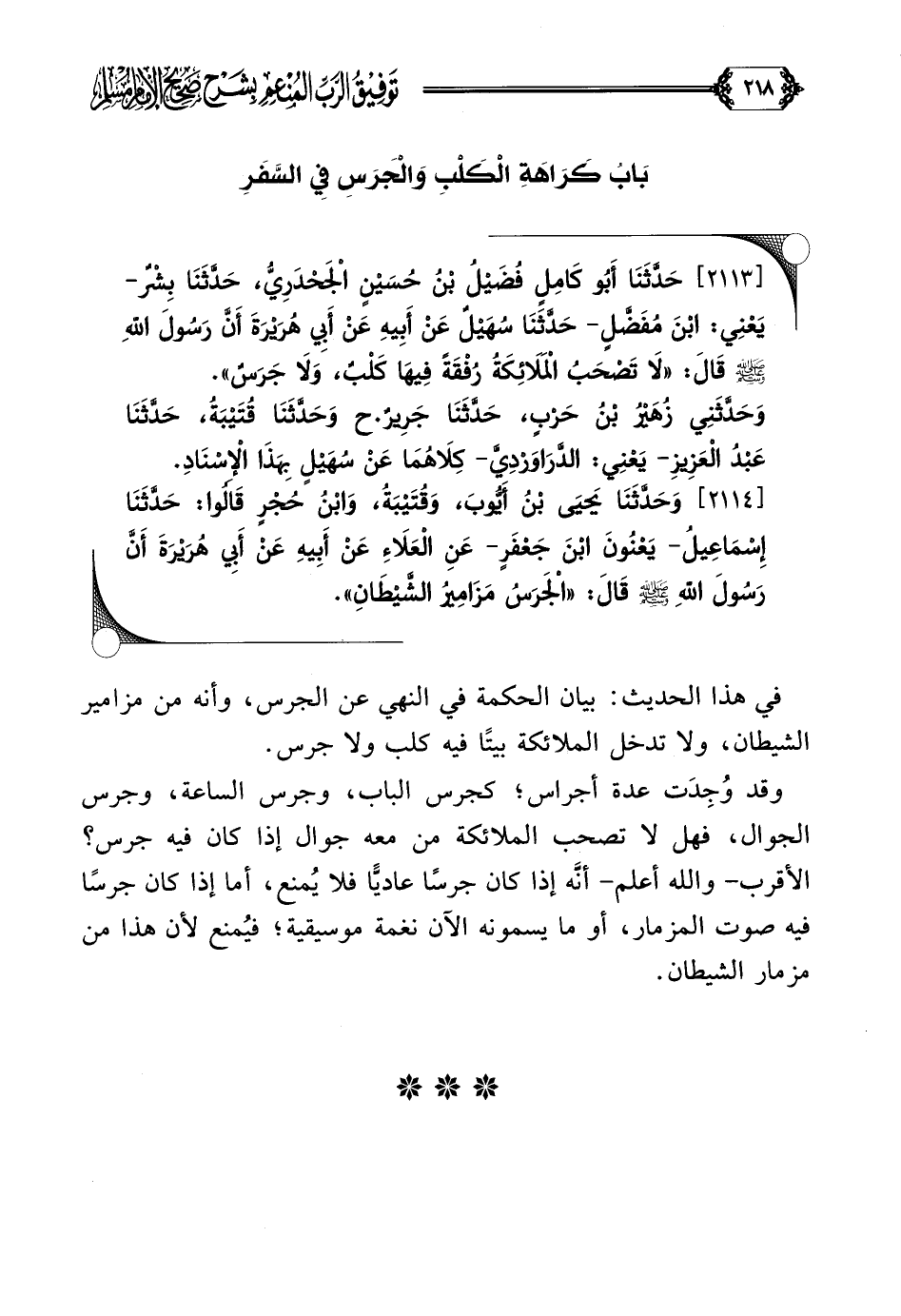 [٢١١٤] وَحَدَّثَنَا يَحيَى بْنُ أَيُّوبَ، وَقُتَيْبَةُ، وَابْنُ حُجْرٍ قَالُوا: حَدَّثَنَا إِسْمَاعِيلُ- يَعْنُونَ ابْنَ جَعْفَرٍ- عَنِ الْعَلَاءِ عَنْ أَبِيهِ عَنْ أَبِي هُرَيْرَةَ أَنَّ رَسُولَ اللَّهِ صلى الله عليه وسلم قَالَ: ((الْجَرَسُ مَزَامِيرُ الشَّيْطَانِ)).