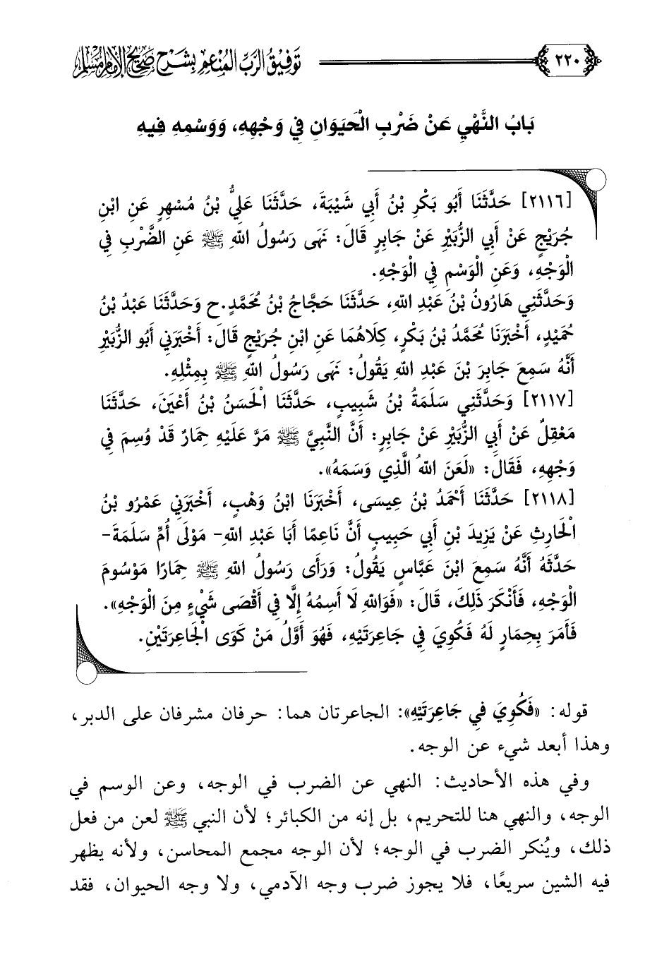 [٢١١٨] حَدَّثَنَا أَحْمَدُ بْنُ عِيسَى، أَخْبَرَنَا ابْنُ وَهْبٍ، أَخْبَرَنِي عَمْرُو بْنُ الْحَارِثِ عَنْ يَزِيدَ بْنِ أَبِي حَبِيبٍ أَنَّ نَاعِمًا أَبَا عَبْدِ اللَّهِ- مَوْلَى أُمِّ سَلَمَةَ- حَدَّثَهُ أَنَّهُ سَمِعَ ابْنَ عَبَّاسٍ يَقُولُ: وَرَأَى رَسُولُ اللَّهِ صلى الله عليه وسلم حِمَارًا مَوْسُومَ الْوَجْهِ، فَأَنْكَرَ ذَلِكَ، قَالَ: ((فَوَاللَّهِ لَا أَسِمُهُ إِلَّا فِي أَقْصَى شَيْءٍ مِنَ الْوَجْهِ)). فَأَمَرَ بِحِمَارٍ لَهُ فَكُوِيَ فِي جَاعِرَتَيْهِ، فَهُوَ أَوَّلُ مَنْ كَوَى الْجَاعِرَتَيْنِ.