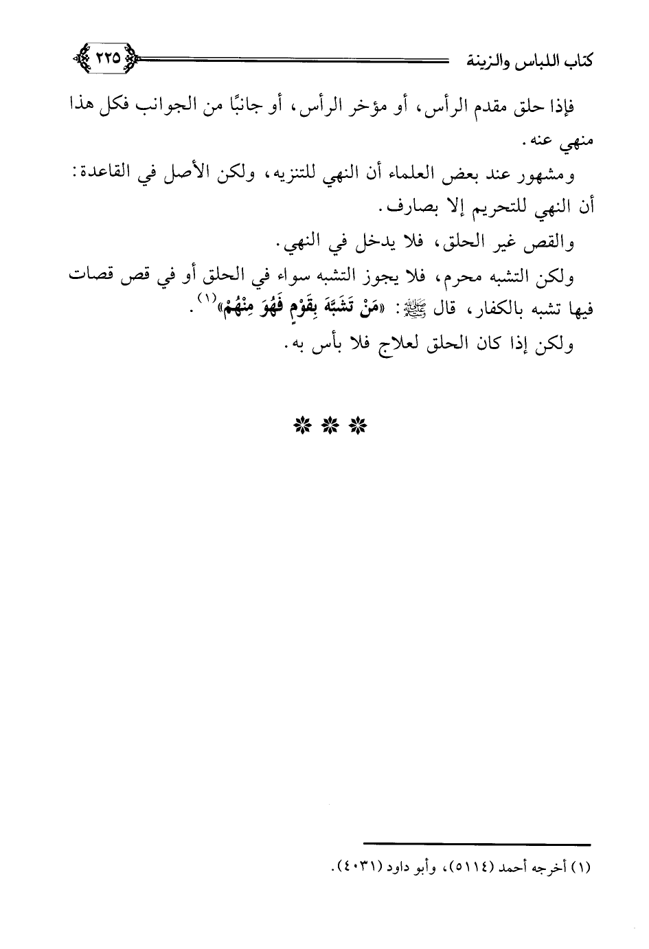 ولكن التشبه محرم، فلا يجوز التشبه سواء في الحلق أو في قص قصات فيها تشبه بالكفار، قال صلى الله عليه وسلم: ((مَنْ تَشَبَّهَ بِقَوْمٍ فَهُوَ مِنْهُمْ)) (¬١).
