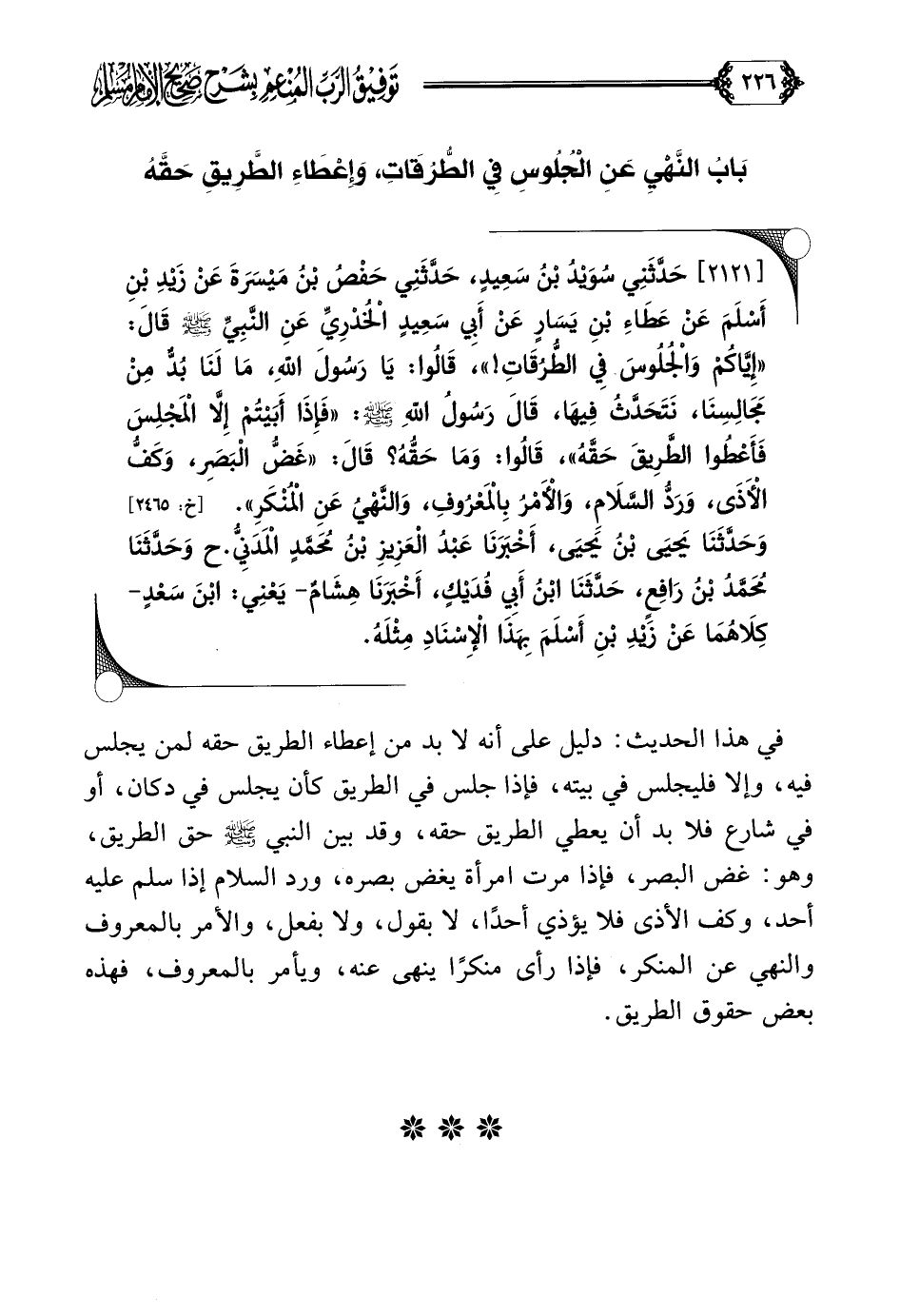 [٢١٢١] حَدَّثَنِي سُوَيْدُ بْنُ سَعِيدٍ، حَدَّثَنِي حَفْصُ بْنُ مَيْسَرَةَ عَنْ زَيْدِ بْنِ أَسْلَمَ عَنْ عَطَاءِ بْنِ يَسَارٍ عَنْ أَبِي سَعِيدٍ الْخُدْرِيِّ عَنِ النَّبِيِّ صلى الله عليه وسلم قَالَ: ((إِيَّاكُمْ وَالْجُلُوسَ فِي الطُّرُقَاتِ! ))، قَالُوا: يَا رَسُولَ اللَّهِ، مَا لَنَا بُدٌّ مِنْ مَجَالِسِنَا، نَتَحَدَّثُ فِيهَا، قَالَ رَسُولُ اللَّهِ صلى الله عليه وسلم: ((فَإِذَا أَبَيْتُمْ إِلَّا الْمَجْلِسَ فَأَعْطُوا الطَّرِيقَ حَقَّهُ))، قَالُوا: وَمَا حَقُّهُ؟ قَالَ: ((غَضُّ الْبَصَرِ، وَكَفُّ الْأَذَى، وَرَدُّ السَّلَامِ، وَالْأَمْرُ بِالْمَعْرُوفِ، وَالنَّهْيُ عَنِ الْمُنْكَرِ)).